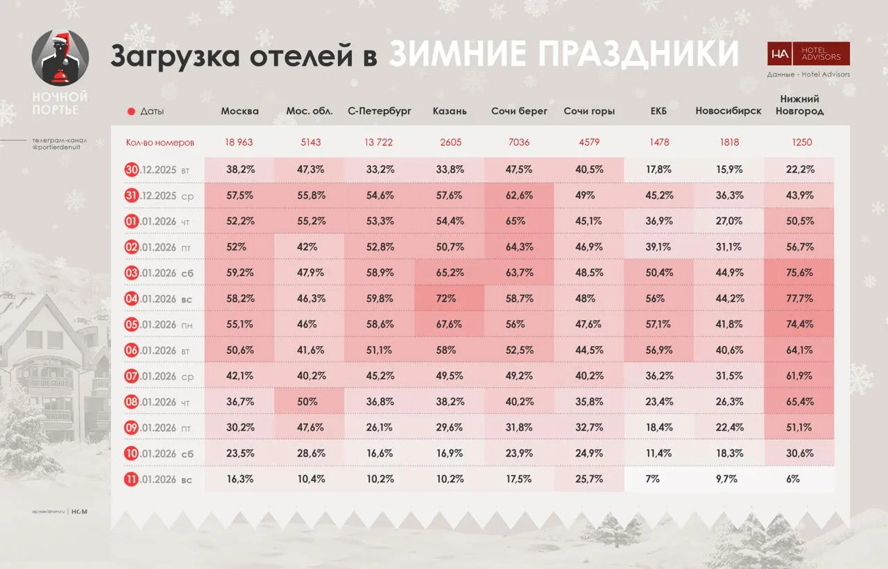️Самые дорогие каникулы — снова в Республике Алтай: 32,4 тыс. за ночь в среднем и 80,5 тыс. в 4–5*. Причём верхний сегмент там просел по броням на 70%. Цены остались космическими, а турист — сделал шаг в сторону. На другом полюсе — взрывной рост спроса: Камчатка (+180%), Магадан (+166%), Астрахань (+121%), Калмыкия, Коми (+115%), плюс сильные результаты ХМАО, Ростовской области, Севастополя. Формируется новый «второй эшелон» зимних направлений, который раньше почти не светился в новогодней статистике.