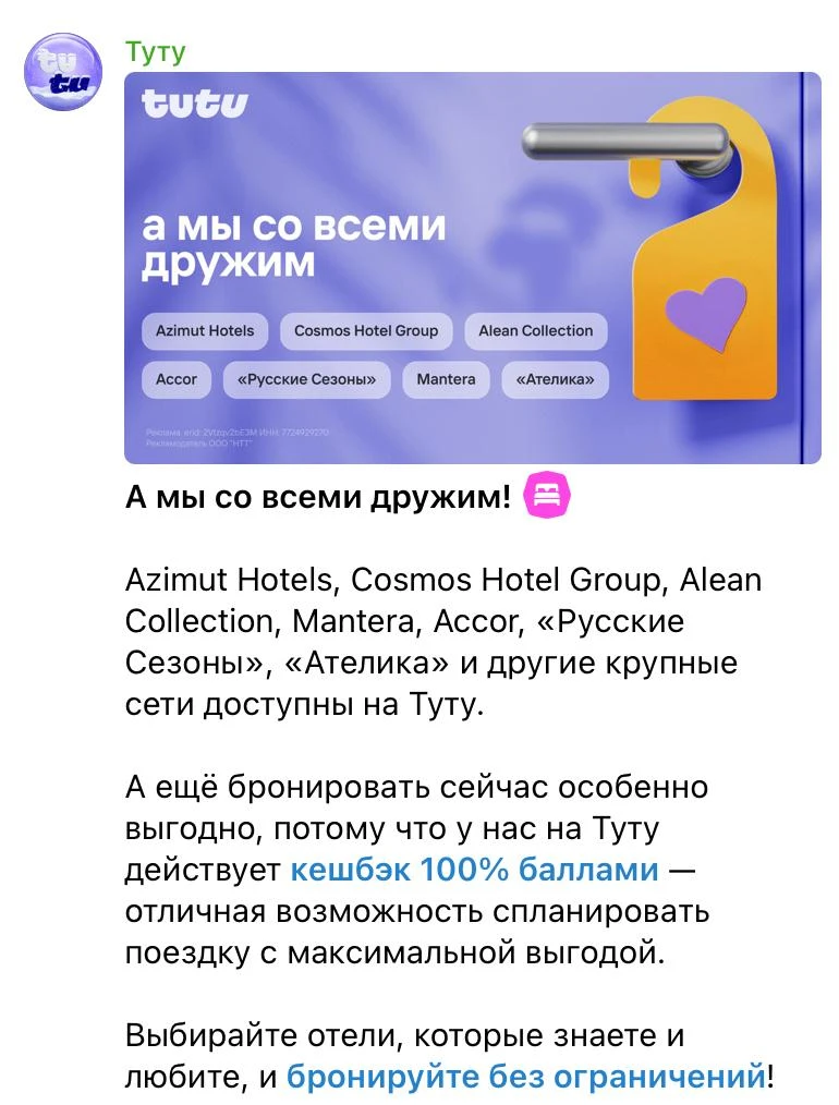 Первым в инфополе зашёл Tutu․ru с максимально прямолинейным месседжем «А мы со всеми дружим». В креативе — весь пул сетей, синхронно отключивших продажи у Яндекса: Azimut Hotels, Cosmos Hotel Group, Alean Collection, Mantera Group, Accor, «Русские Сезоны», «Ателика» и другие. Сигнал максимально прозрачный: инвентарь на месте, бронирования доступны, рынок никуда не делся.