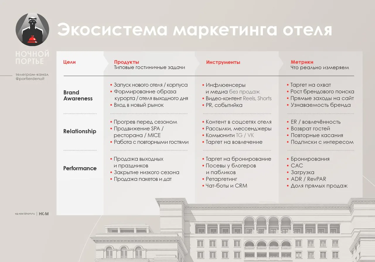 Давно собирался и наконец нарисовал для вас таблицу "Экосистема маркетинга отеля" — как раз про то, чтобы разложить хаос по полкам и связать действия с бизнес-задачами.