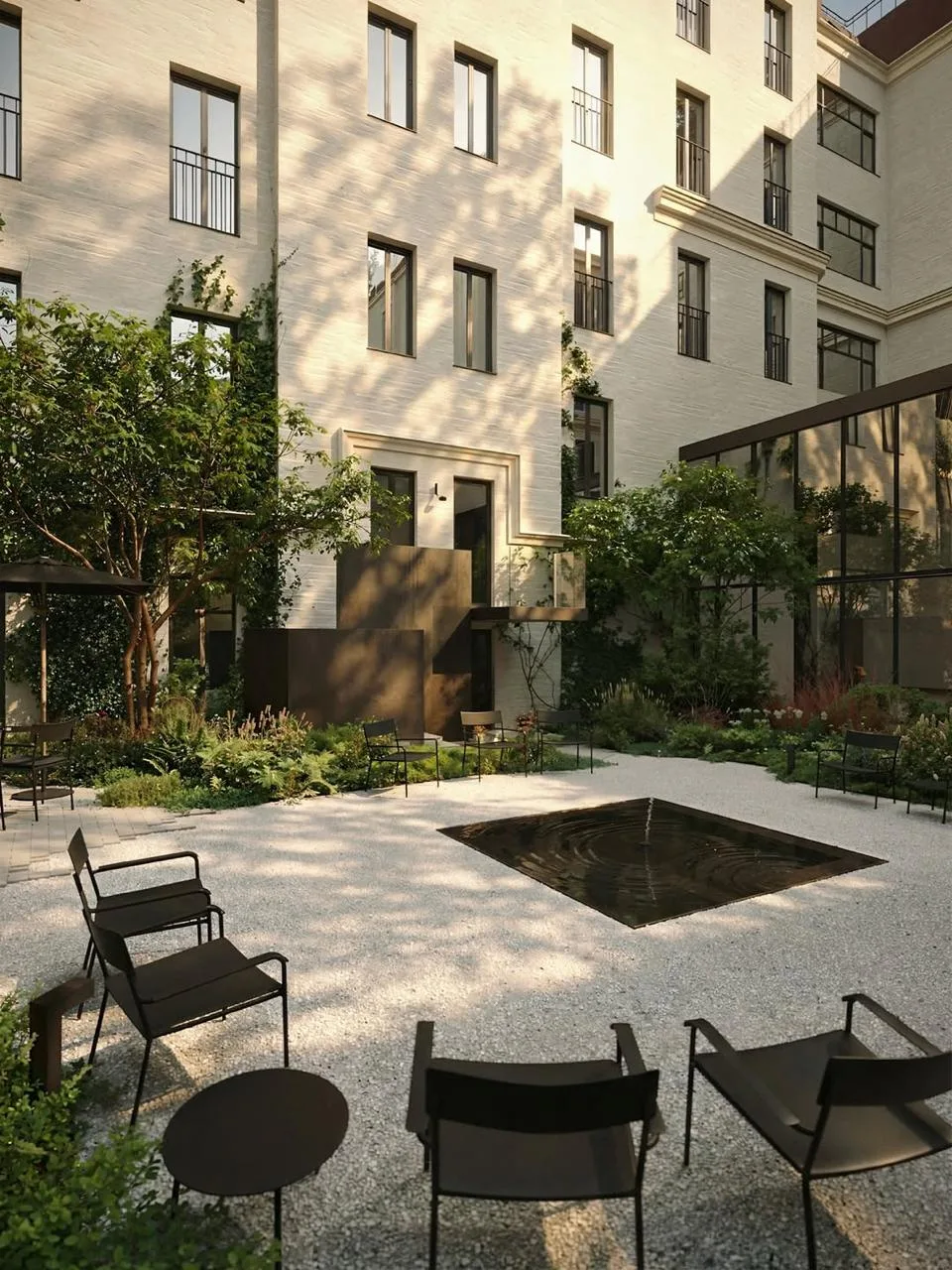 Показали, как будет выглядеть двор будущего отеля House of Faith в Санкт-Петербурге — рендеры опубликовала студия APAA (Алексей Пенюк и Анастасия Артемьева). Проект развивается в историческом здании XIX века с видом на Воскресенскую набережную.