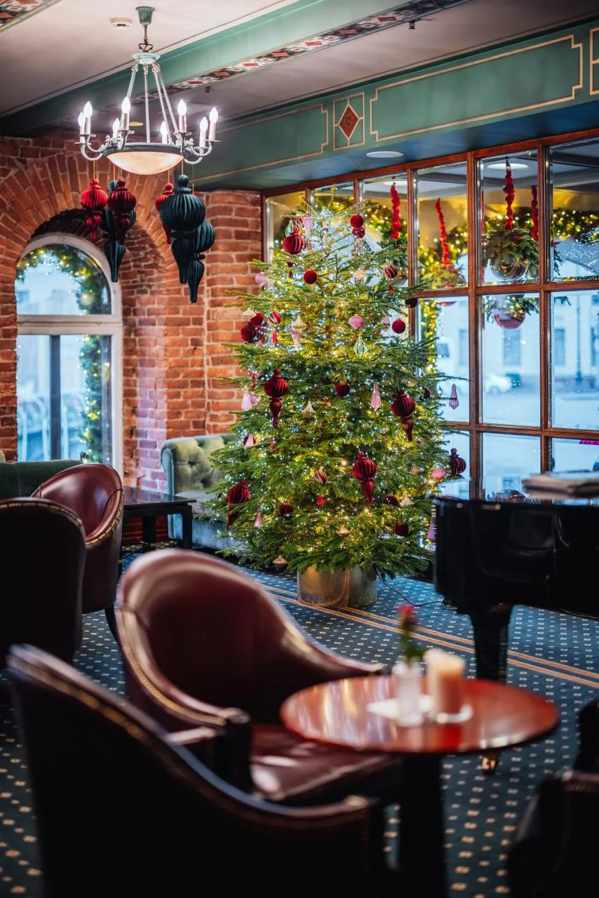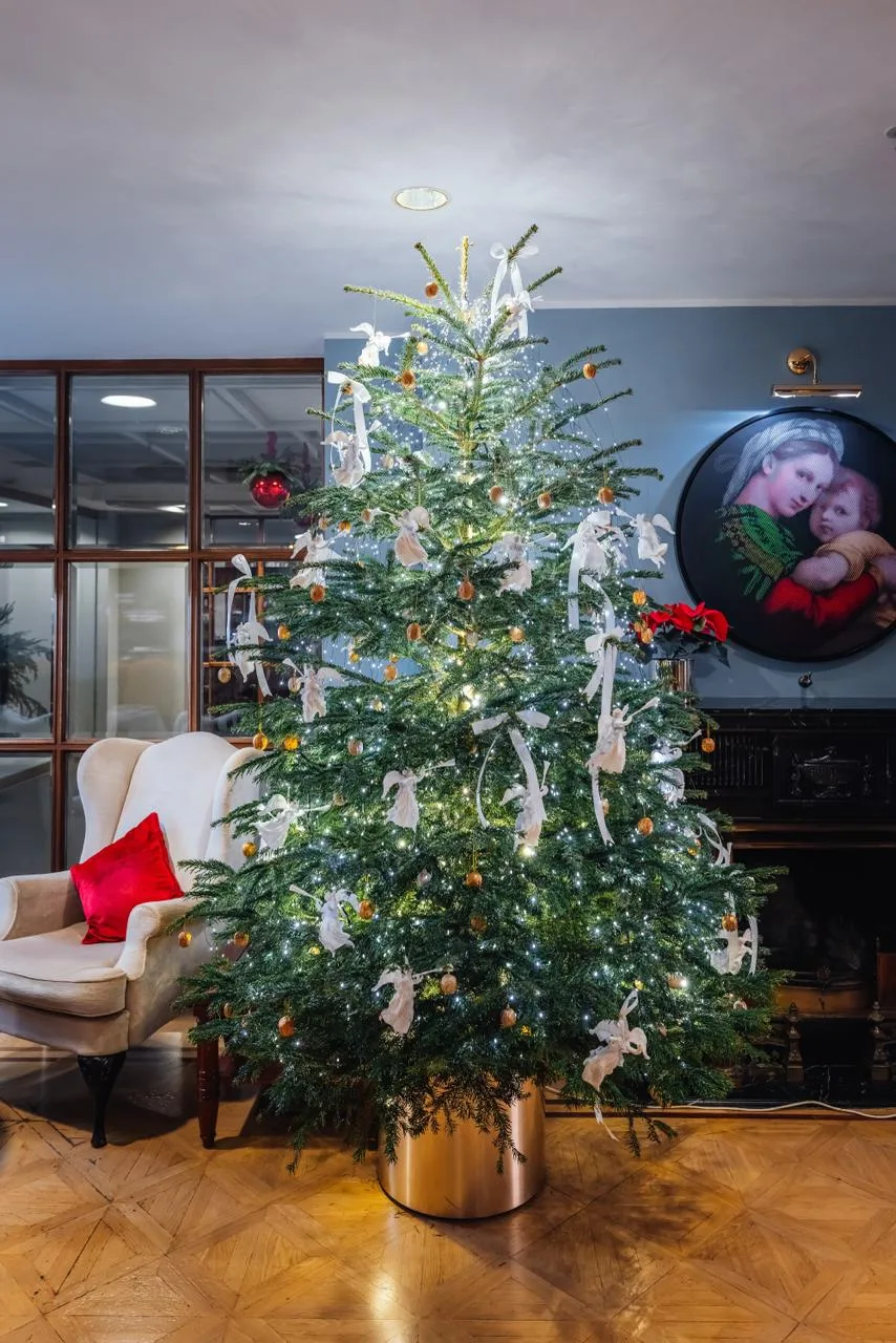 Главная ставка — на живую ель в лобби. Отель выбрал дерево у поставщика, который обеспечивает елями Дворцовую площадь: подбор занял две недели, десятки фото со всех ракурсов, логистика из Перми — три суток, итоговая стоимость — около 100 тыс. рублей. Для индустрии это мягкое напоминание: если хотите выделиться зимой, стоит вкладываться в реальный фактор «вау», который гость считывает ещё до ресепшена. Живое дерево в лобби на фоне искусственных елей у соседей-отельеров выглядит как понятный, дорогой и хорошо запоминающийся жест.