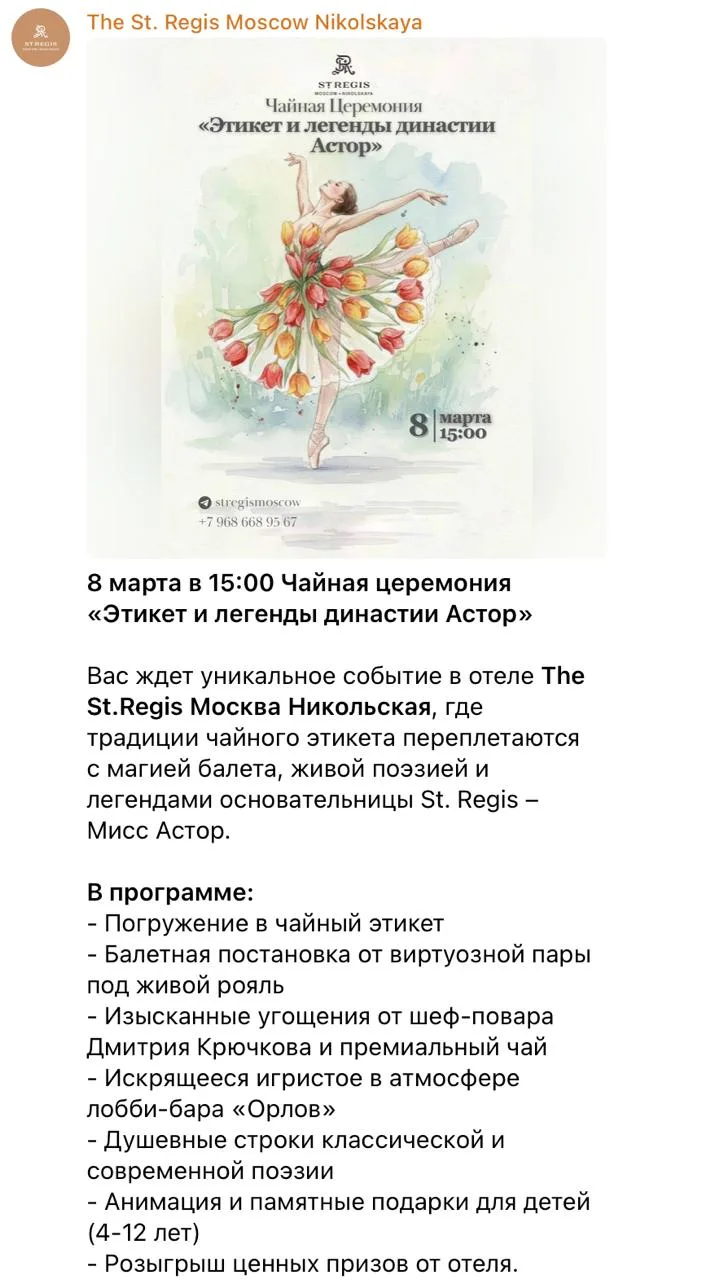 8 марта в The St. Regis Москва Никольская — чайная церемония «Этикет и легенды династии Астор». Формулировка уже сама по себе звучит так, будто тебя сейчас не чаем поить будут, а в родословную запишут. В программе всё и сразу: балет под рояль, поэзия, игристое, легенды мисс Астор и, на всякий случай, анимация для детей — чтобы никто не ушёл без культурного шока.