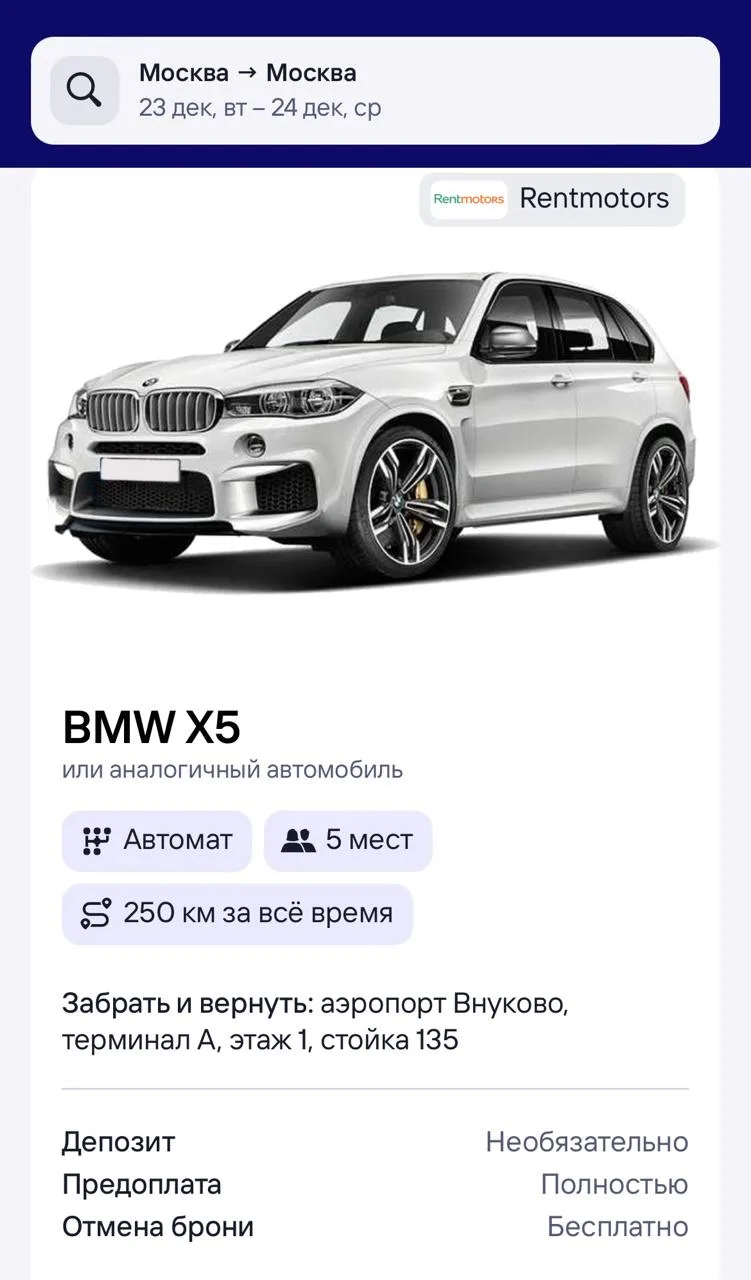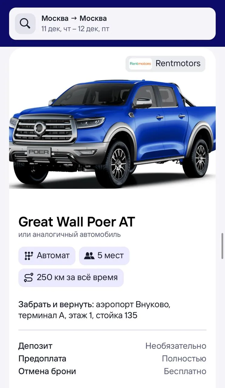 Автопарк разношёрстный: база — китайские модели, но в выдаче встречаются Ford, BMW и Porsche. Забрать машину можно в аэропорту, на вокзале или в городе; требования стандартные — с 21 года и от двух лет стажа. Лимит пробега — 250 км в сутки, отмена до начала аренды бесплатная, есть опция страховки с полным покрытием.