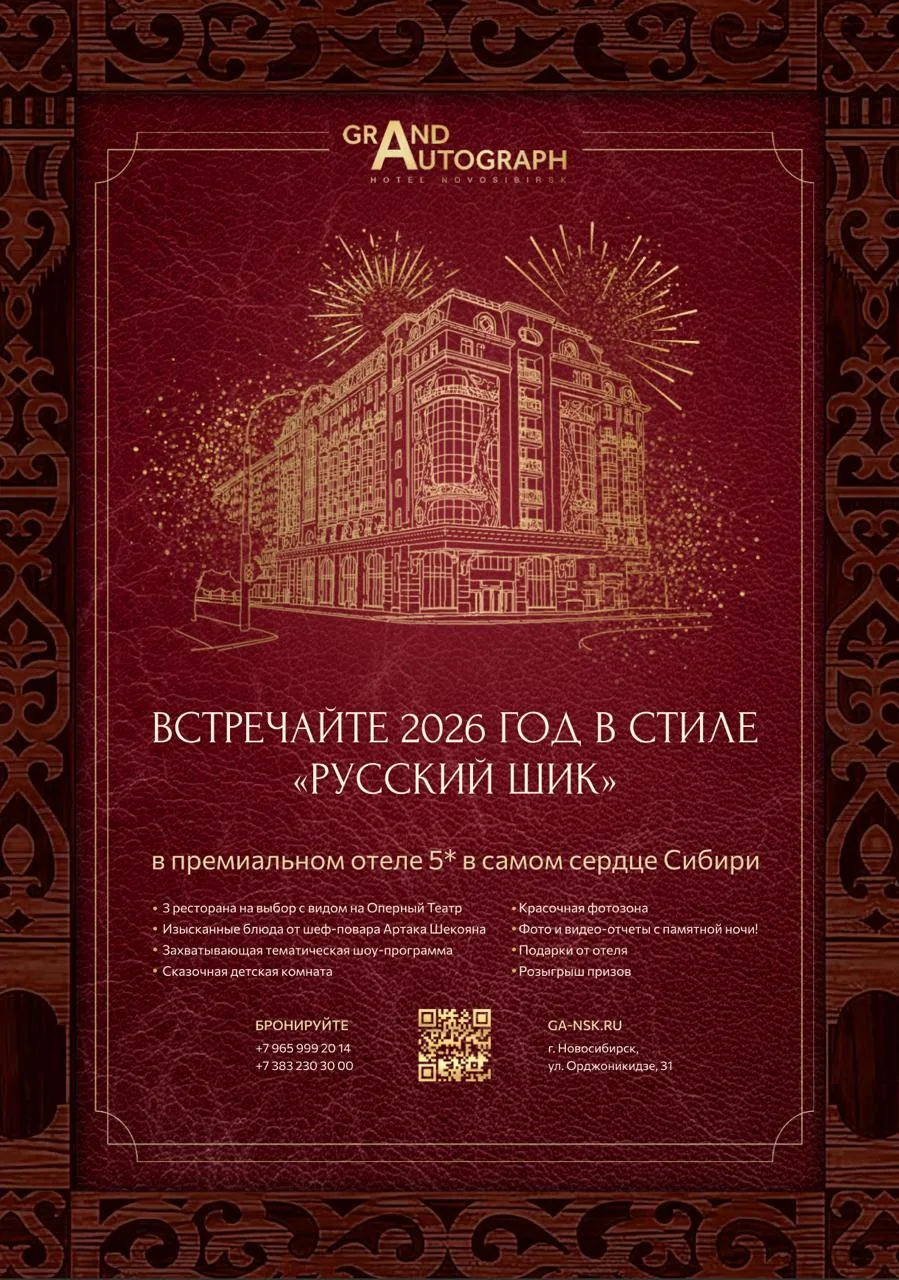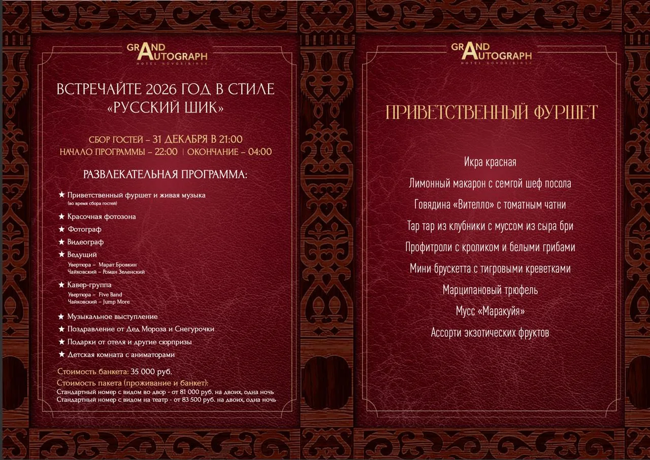 Новосибирский Grand Autograph показал, как должен выглядеть новогодний продукт, если цель — продать не просто ночь, а заранее упакованную «систему развлечений». В презентации видно, что отель делает ставку на плотную программу: сбор гостей с 21:00, живой фуршет, несколько музыкальных блоков, кавер-группы и продуманную детскую комнату с аниматорами.
