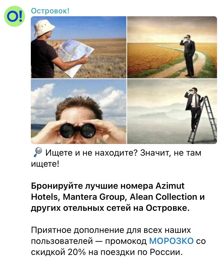 Почти следом подключился Ostrovok․ru — но уже через мемную механику. Коммуникация с биноклем и подписью «Ищете и не находите? Значит, не там ищете» считывается без расшифровок. Те же сети, тот же посыл — только поданный через иронию и пользовательский инсайт.