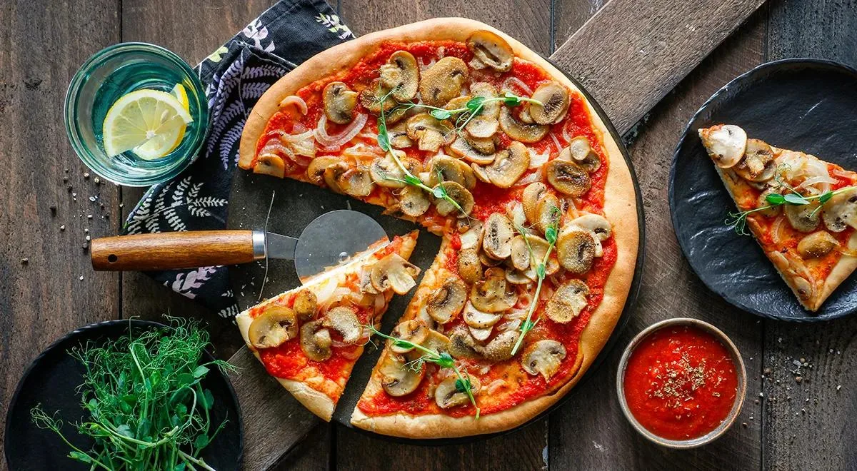 6. Духовку разогрейте до 180 °C. Переложите основы пиццы на противни прямо на пергаменте и выпекайте 20 минут. Затем достаньте, смажьте томатным соусом, выложите жареный лук и грибы, посыпьте чёрным перцем и сушёным чесноком. Верните пиццу в духовку и выпекайте ещё 15–20 минут до полной готовности теста. Готовую пиццу сразу разрежьте и подавайте. Количество муки и воды при замесе может немного меняться в зависимости от её качества: ориентируйтесь на консистенцию теста — оно должно быть мягким и не липким.