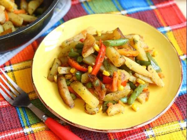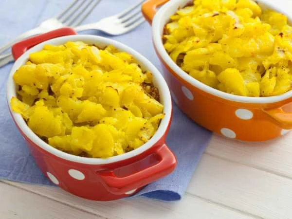 5. К картошке добавьте 1 ст. л. растительного масла, посолите и поперчите по вкусу, перемешайте. Можно заранее разделить картофель на 2 части, так как блюдо будет двухслойным.