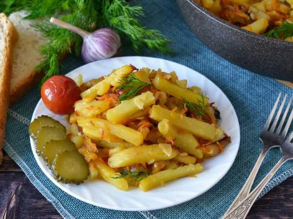 4. Пока жарится лук, почистите картошку и натрите её на «щелях» или нарежьте тонкими пластинками любым другим способом.