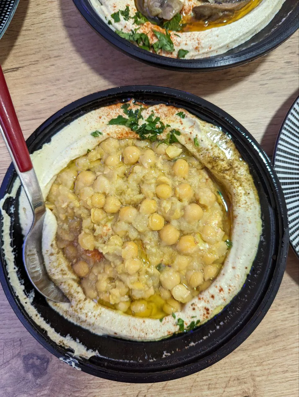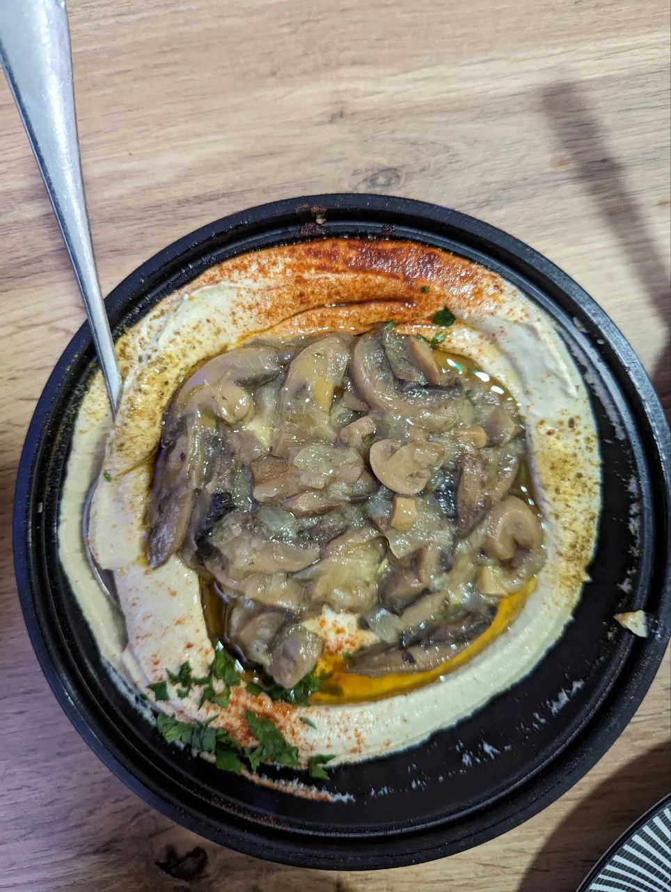 Когда хумус готов, выложить его в тарелку не горкой, верх должен быть ровным. Ложкой сделать в середине небольшое углубление, чтобы положить любую добавку: жареные грибы, вареный не перебитый нут, сверху полейте оливковое (растительное) масло и посыпьте паприкой, зеленью петрушки. Можно присыпать сверху кедровыми орешками, вялеными помидорами, острым порубленным перцем. Можно намазывать на подсушенный тост.