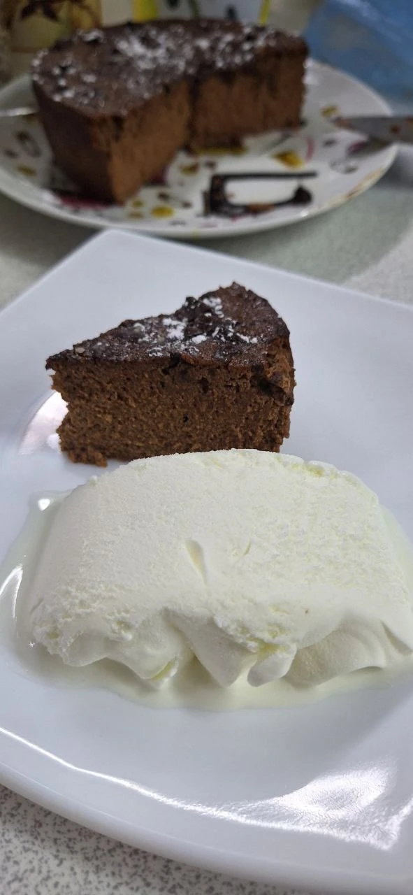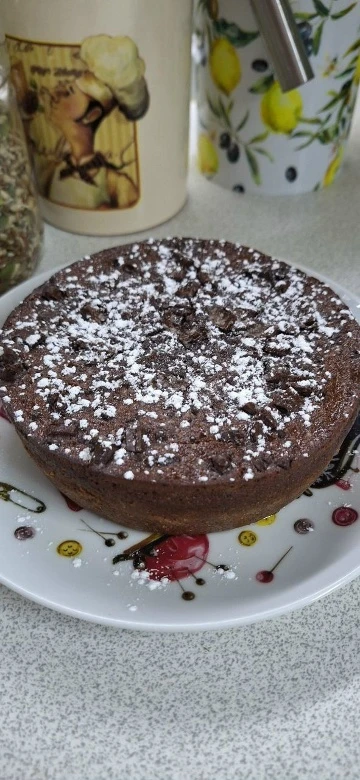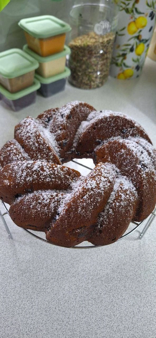 Перелить в форму, у меня силиконовая. Посыпать сверху горьким шоколадом. Выпекать в духовке при t=180-190°С, примерно 35-40 минут. Немного остудить и посыпать слегка сахарной пудрой (по желанию).