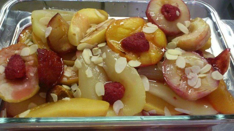 Подготовить любые фрукты: яблоки, груши очистить от семенных коробочек, у персиков и слив вынуть косточки. Посыпать сахарной пудрой, если есть ягоды - добавить, и все слегка присыпать свежетертым мускатным орехом. Запекать при t=180°С, 20-25 минут. Печеные фрукты посыпать орехами, в данном случае - миндальными лепестками.