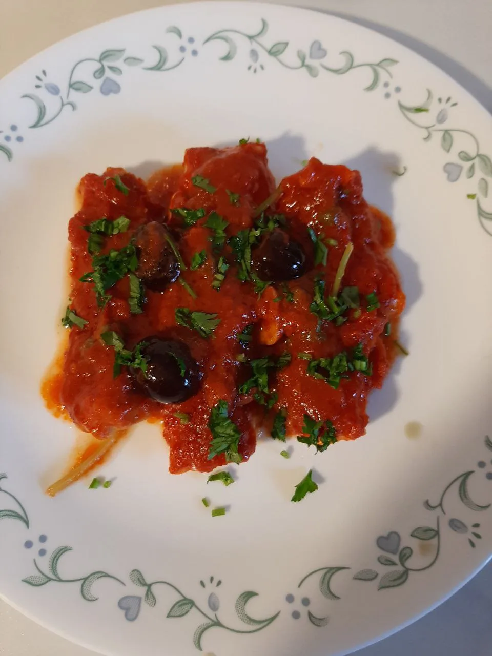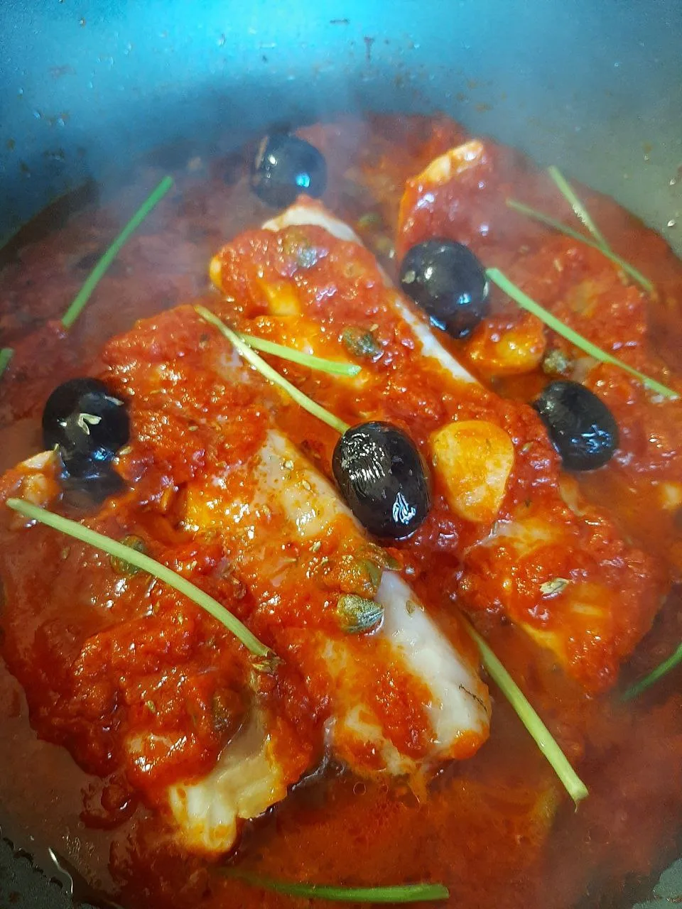 Добавить томаты (если они целые пробить блендером или вилкой промять), добавить каперсы и маслины, стебельки петрушки, орегано. Проварить соус минут 8-10 под крышкой на медленном огне. Когда соус вкусно запахнет добавить филе рыбы (которое предварительно промыть и высушить салфеткой), посолить.