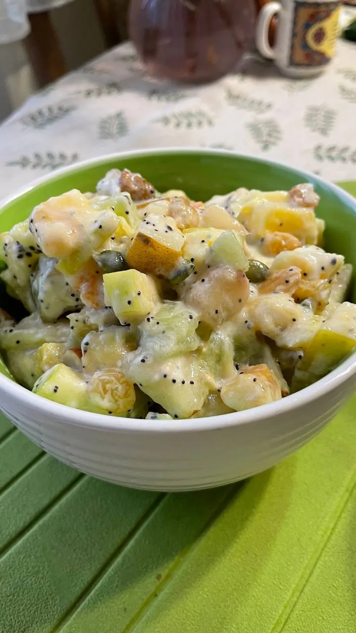 Все нарезать средними кубиками и заправить йогуртом.
