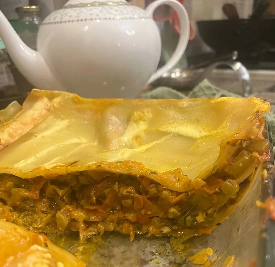 В отдельной тарелке смешиваем соус: постный майонез и кетчуп. В это время в большую кастрюлю с кипящей подсоленной водой забрасываем листы лазаньи ( я забрасываю по 5 шт, как раз на один слой), варить до мягкости 2-3 минуты. Далее в форму для запекания выкладываем слоями соус-листы лазаньи-соус-тушеные овощи и так 2-3 слоя. Верхний слой листы лазаньи с соусом.
