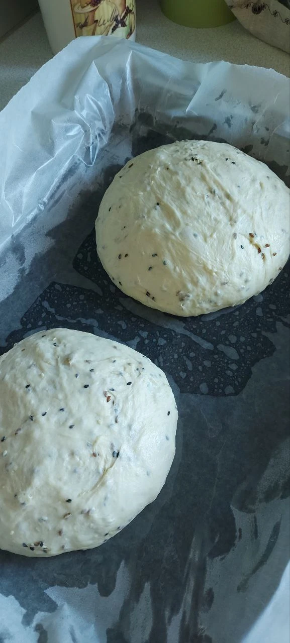 Далее заводим тесто, добавляем семена, тесто будет липким, но муки много не сыпать!
