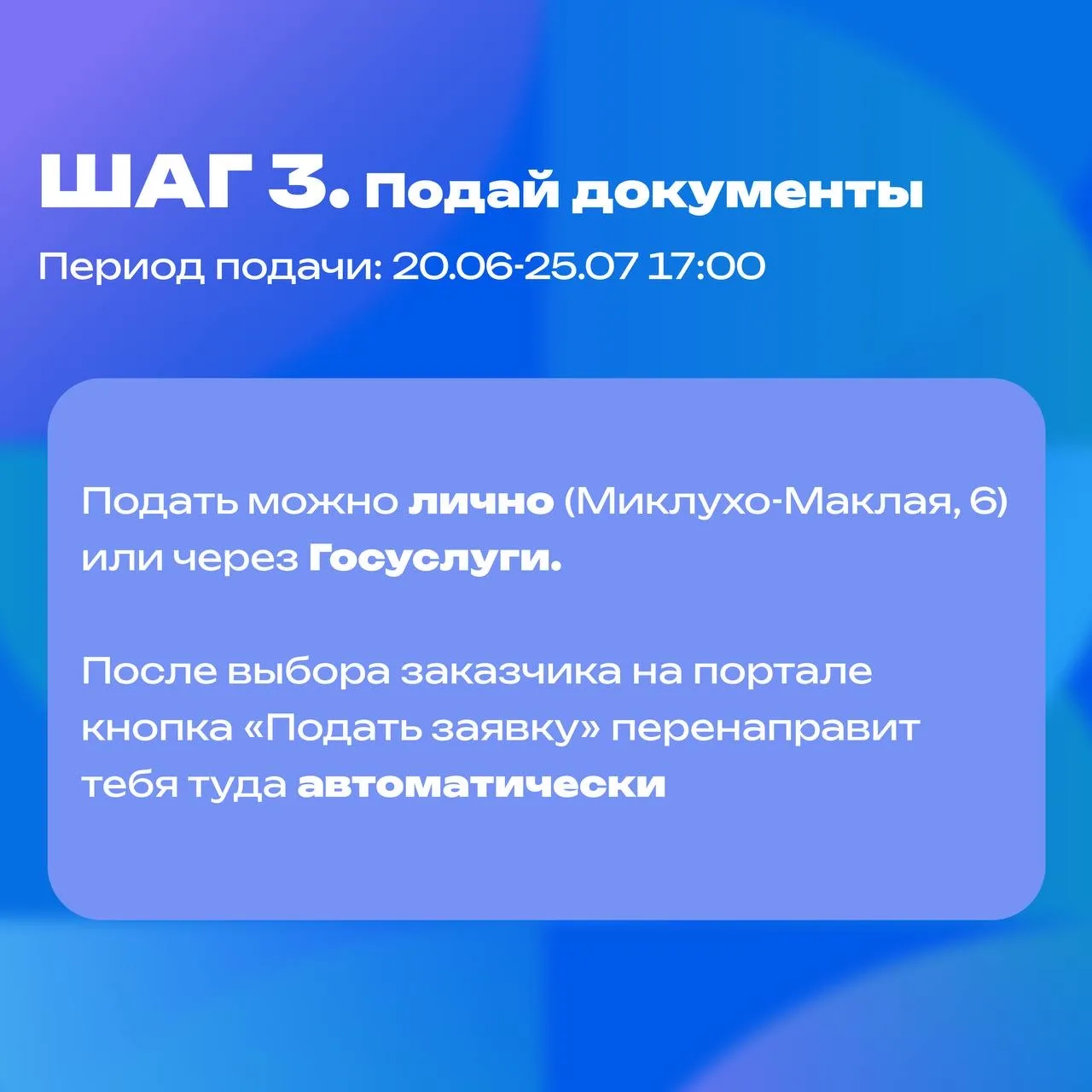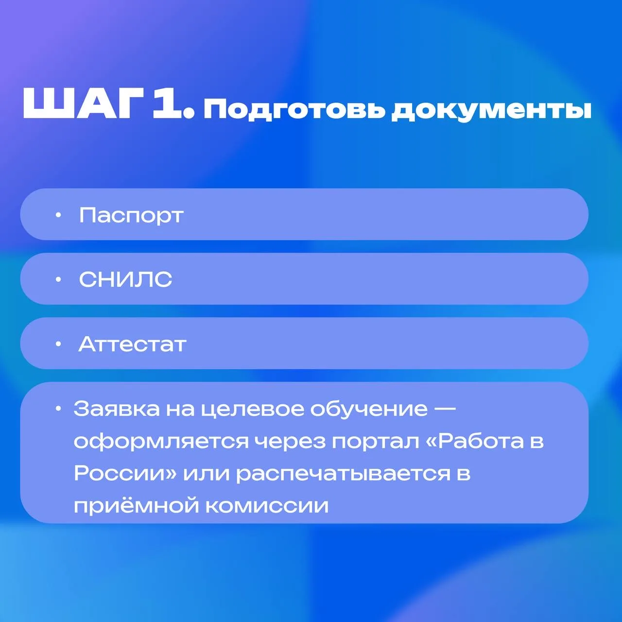 Подробная информация о необходимых документах и сроках подачи заявок — на карточках.