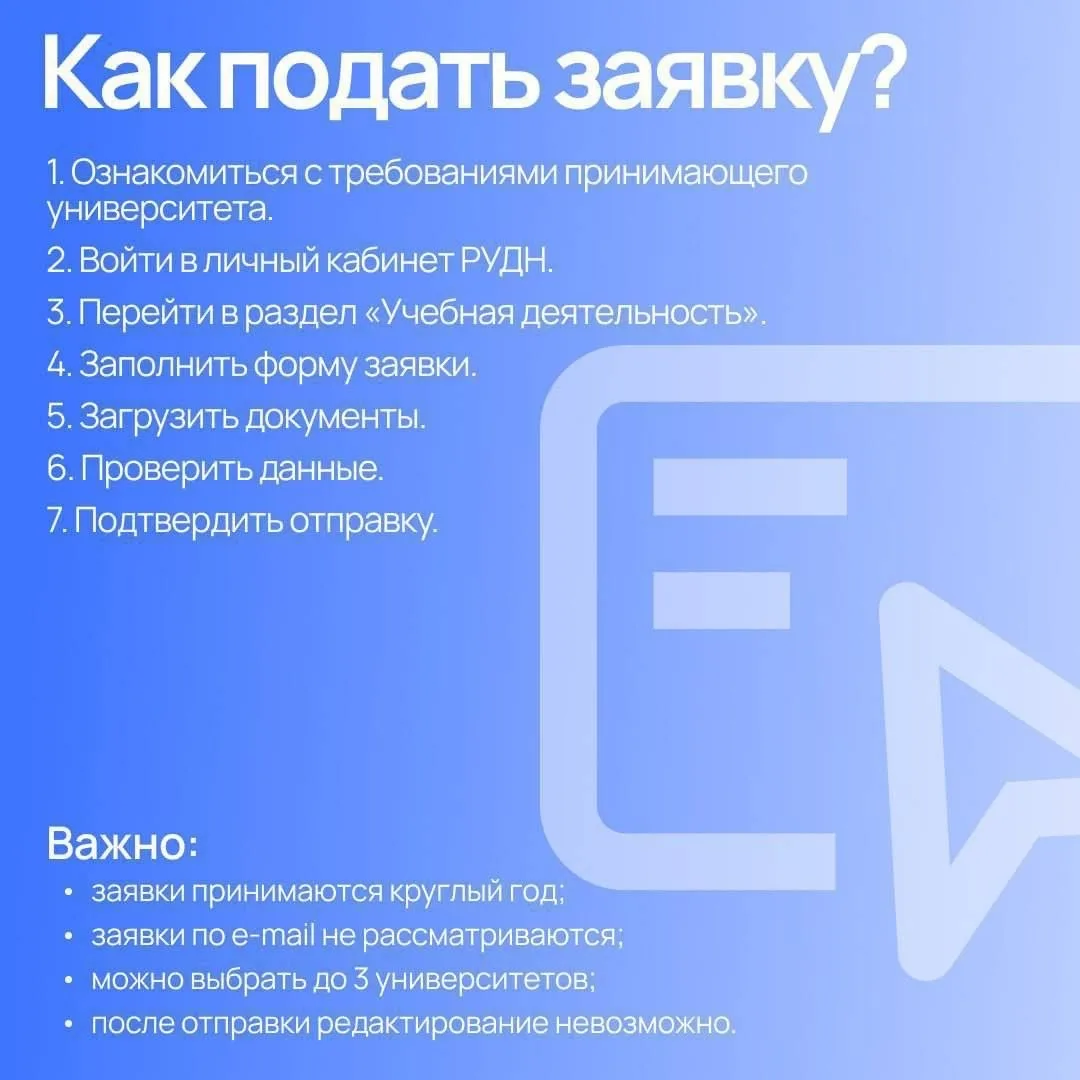 🔹 подать заявку в установленный срок через приложение РУДН;