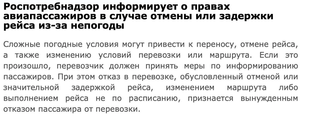 Неблагоприятные погодные условия, которые приводят к отмене рейса, длительной задержке или изменению маршрута, относятся к вынужденному отказу от перевозки. При вынужденном отказе перевозчик обязан вернуть провозную плату полностью, и тариф «невозвратный» здесь не спасает. Об этом напомнил Роспотребнадзор.