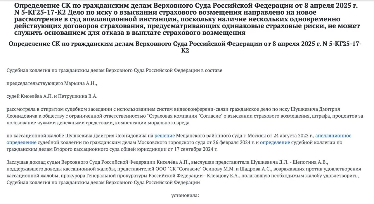 ВС признал такой подход ошибочным и отправил дело на новое рассмотрение. ВС указал, что закон не ограничивает количество договоров личного страхования, которые может заключить один человек. Поэтому наличие нескольких действующих договоров с одинаковыми рисками само по себе не является основанием для отказа в выплате по конкретному договору.