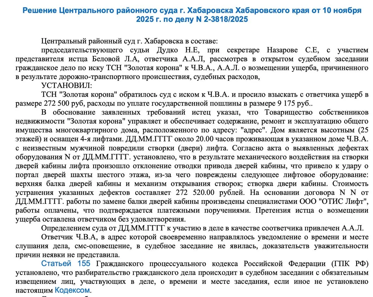 ТСЖ добилось через суд взыскания стоимости ремонта лифта с молодой пары, после «активности» которой дверь кабины получила повреждения. Речь идёт о решении Центрального районного суда г. Хабаровска от 10 ноября 2025 года по делу № 2-3818/2025.