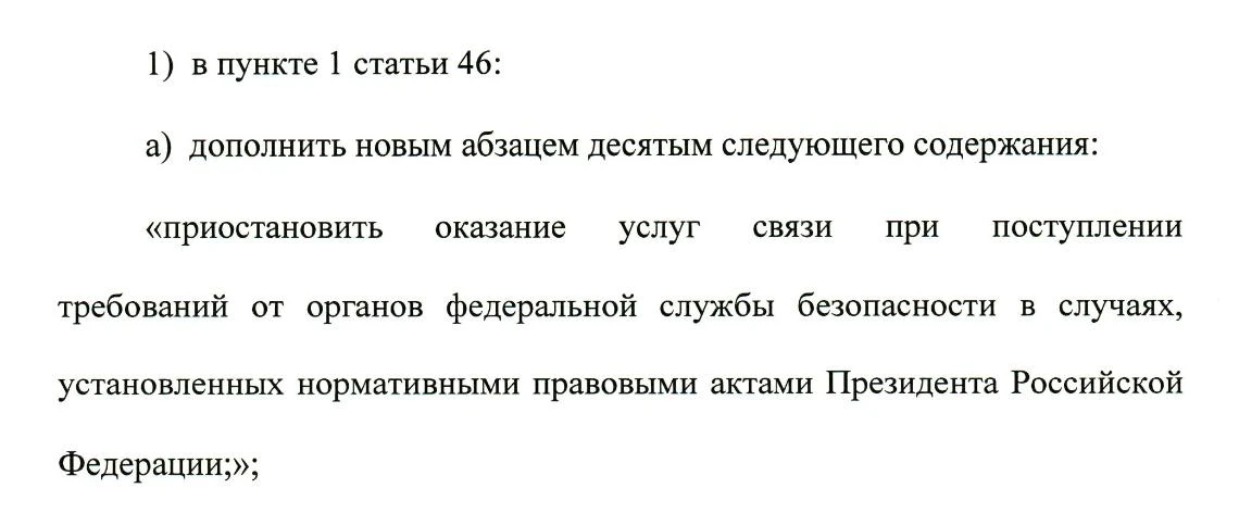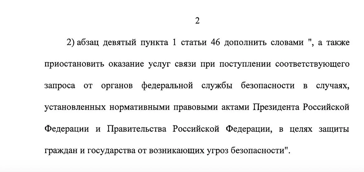 Из текста исключили формулировку «в целях защиты граждан и государства от возникающих угроз безопасности». Теперь закон не связывает отключение связи напрямую с наличием угроз. Основания будут определяться указами Президента РФ. Также из проекта убрали возможность устанавливать такие случаи актами Правительства РФ.