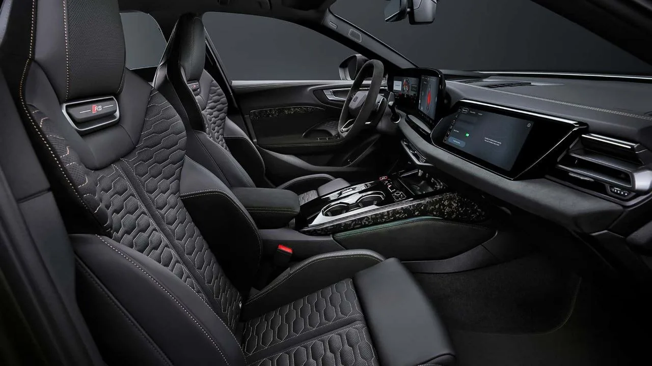 Внутри спортивные кресла с контрастной строчкой, карбон, руль из алькантары и расширенная телеметрия на экранах — можно следить за перегрузками и температурой.