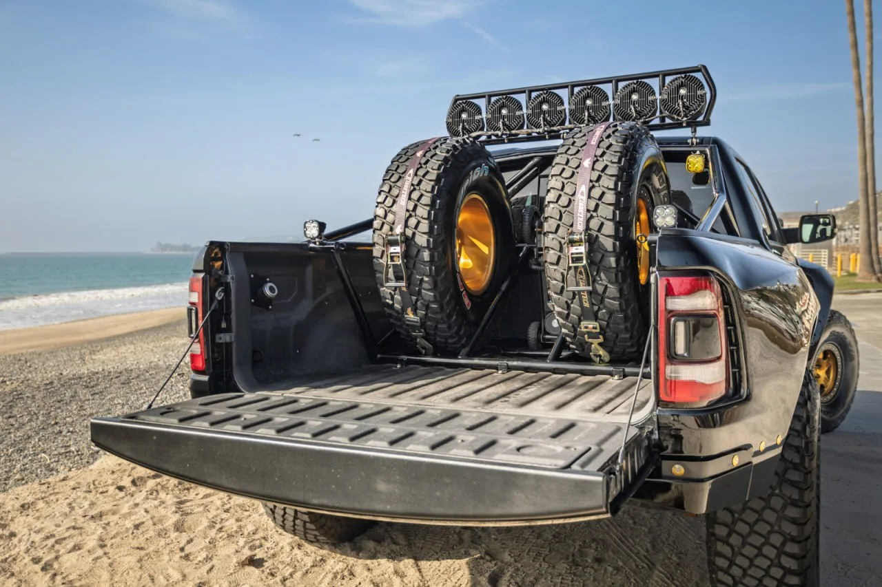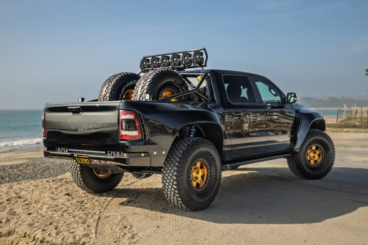 Доработки не ограничились огромными элементами обвеса: среди прочего тачка получила кастомные фонари и дополнительный свет спереди, а также пневмоподвеску, позволяющую занижать клиренс.