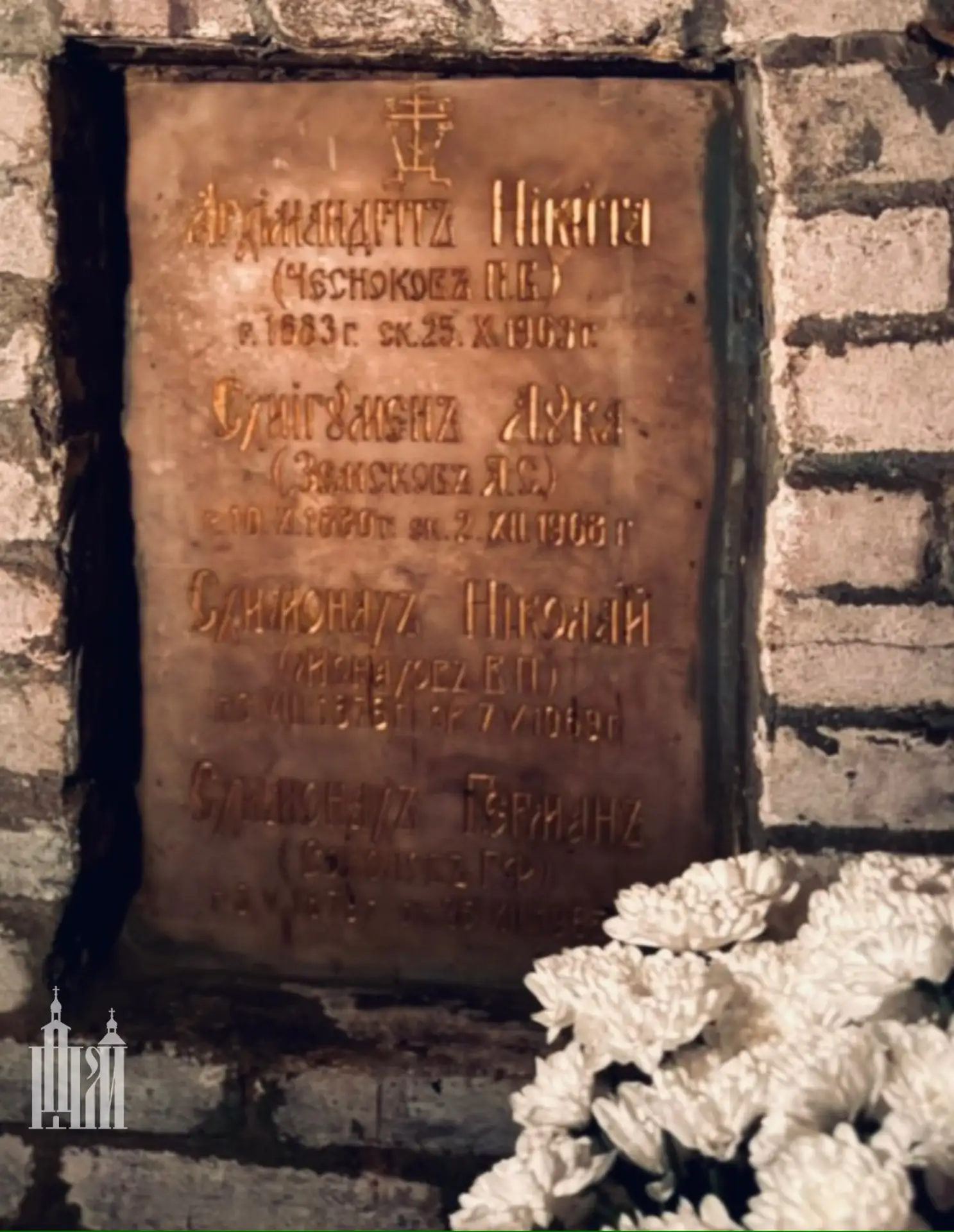 Погребен схиигумен Лука в Богом зданных пещерах слева от Креста.