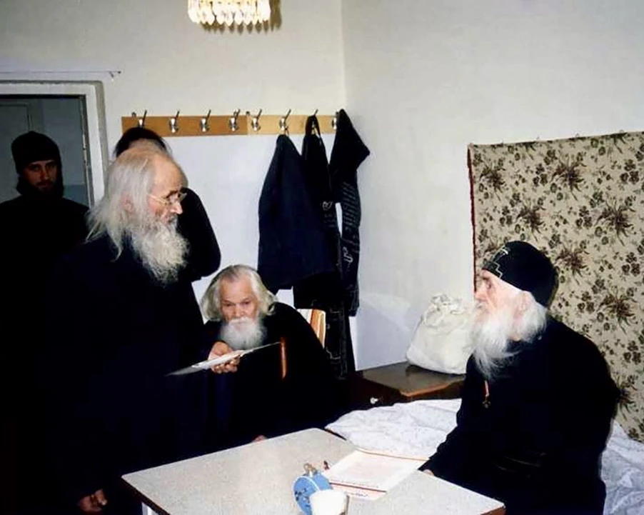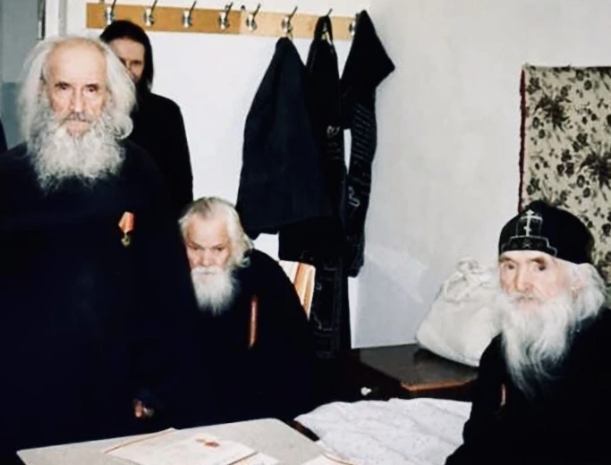 На фото 9 мая 1995 г. архимандрит Нафанаил (Поспелов) в монастырском лазарете вручает ветеранам (мон. Анании и схим. Иринарху (Соляникову)) медали в честь 50-летия Победы в Великой Отечественной войне 1941-45 г.