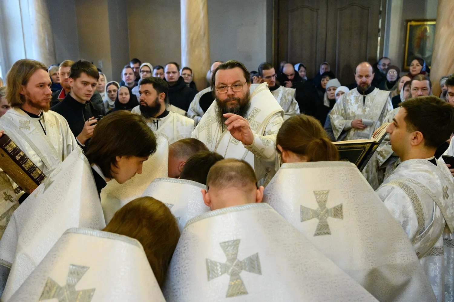 Перед началом богослужения митрополит Матфей вручил подрясники студентам начального курса Псково-Печерской духовной семинарии и совершил постриг во чтецы студентов четвертого, выпускного курса семинарии.