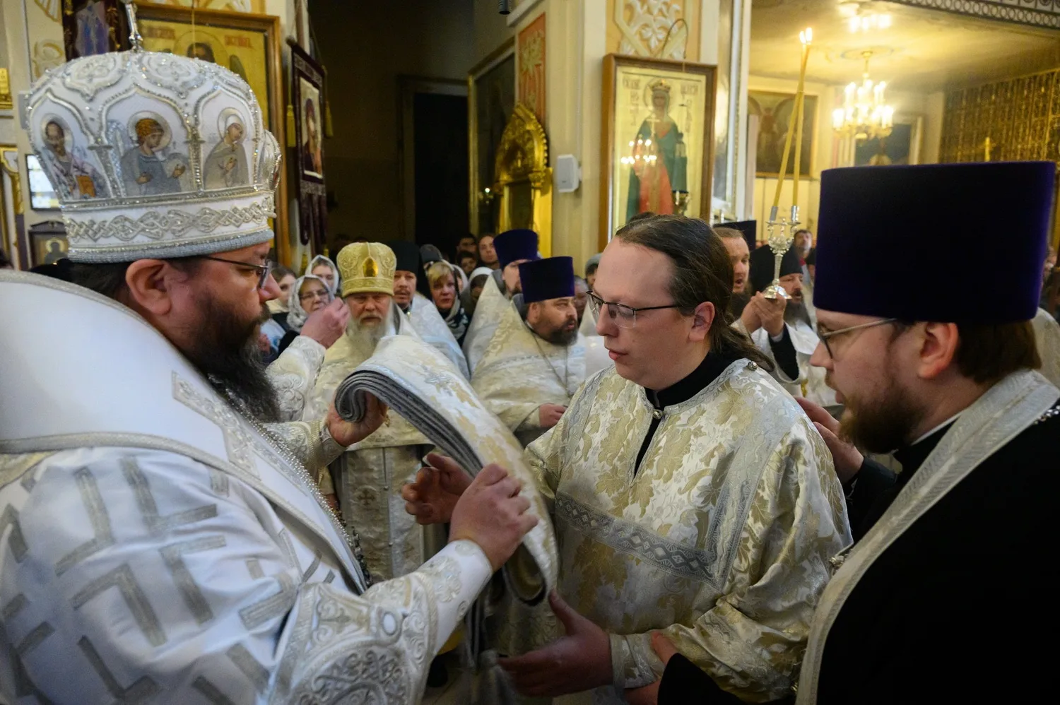 На малом входе Божественной литургии по благословению Святейшего Патриарха Московского и всея Руси Кирилла митрополит Матфей удостоил насельника Свято-Успенского Псково-Печерского монастыря иеродиакона Симеона (Кивайло) права ношения двойного ораря.