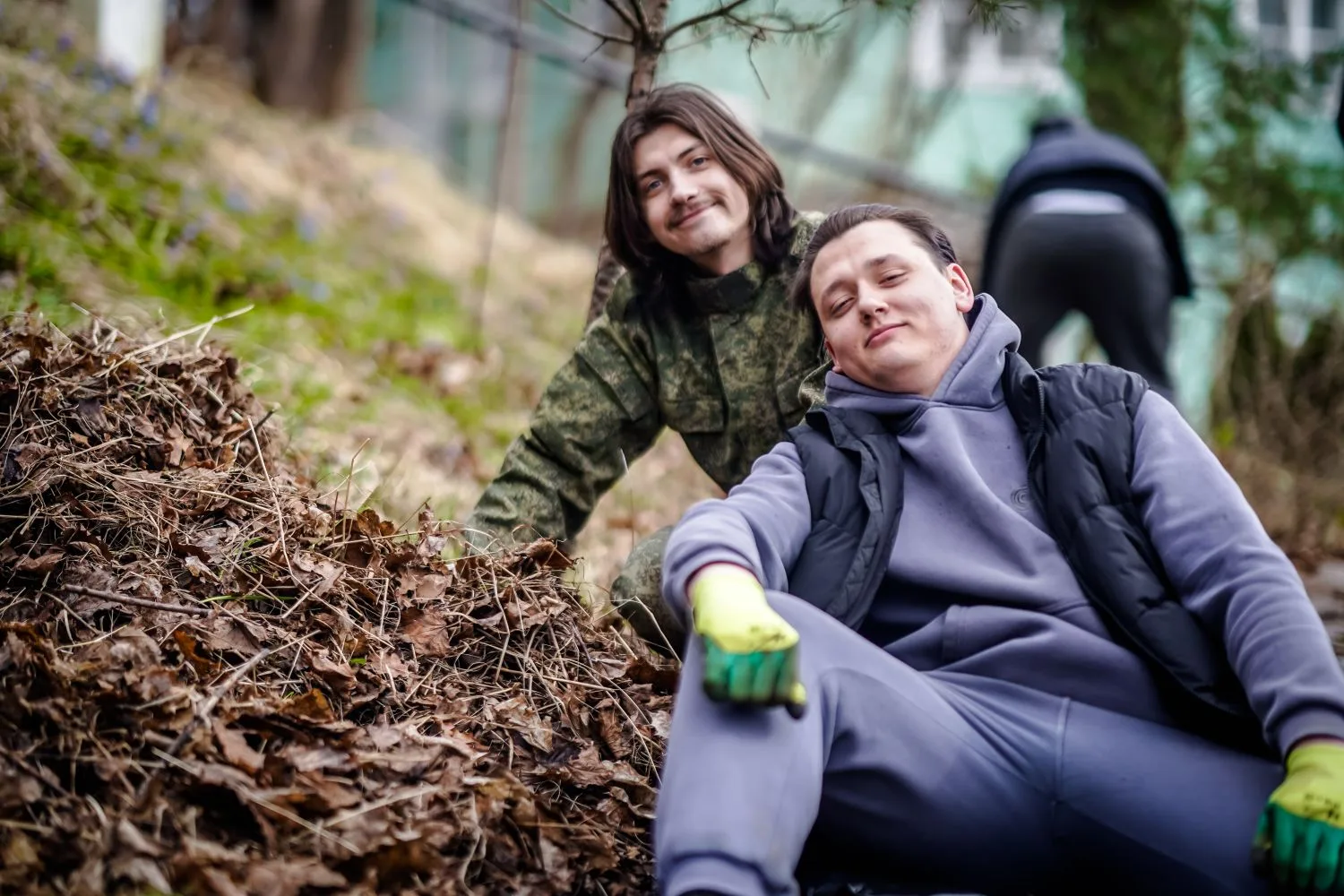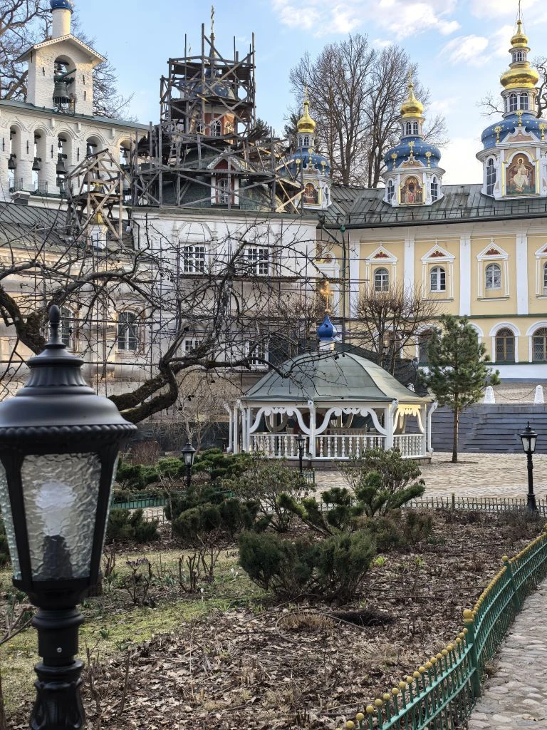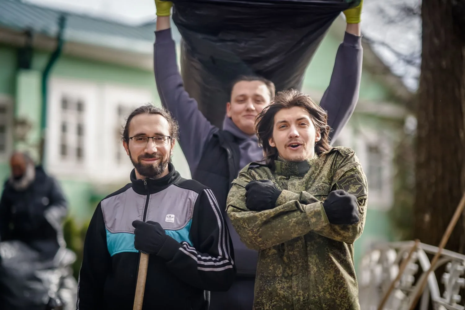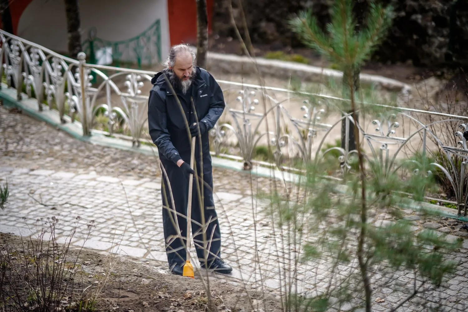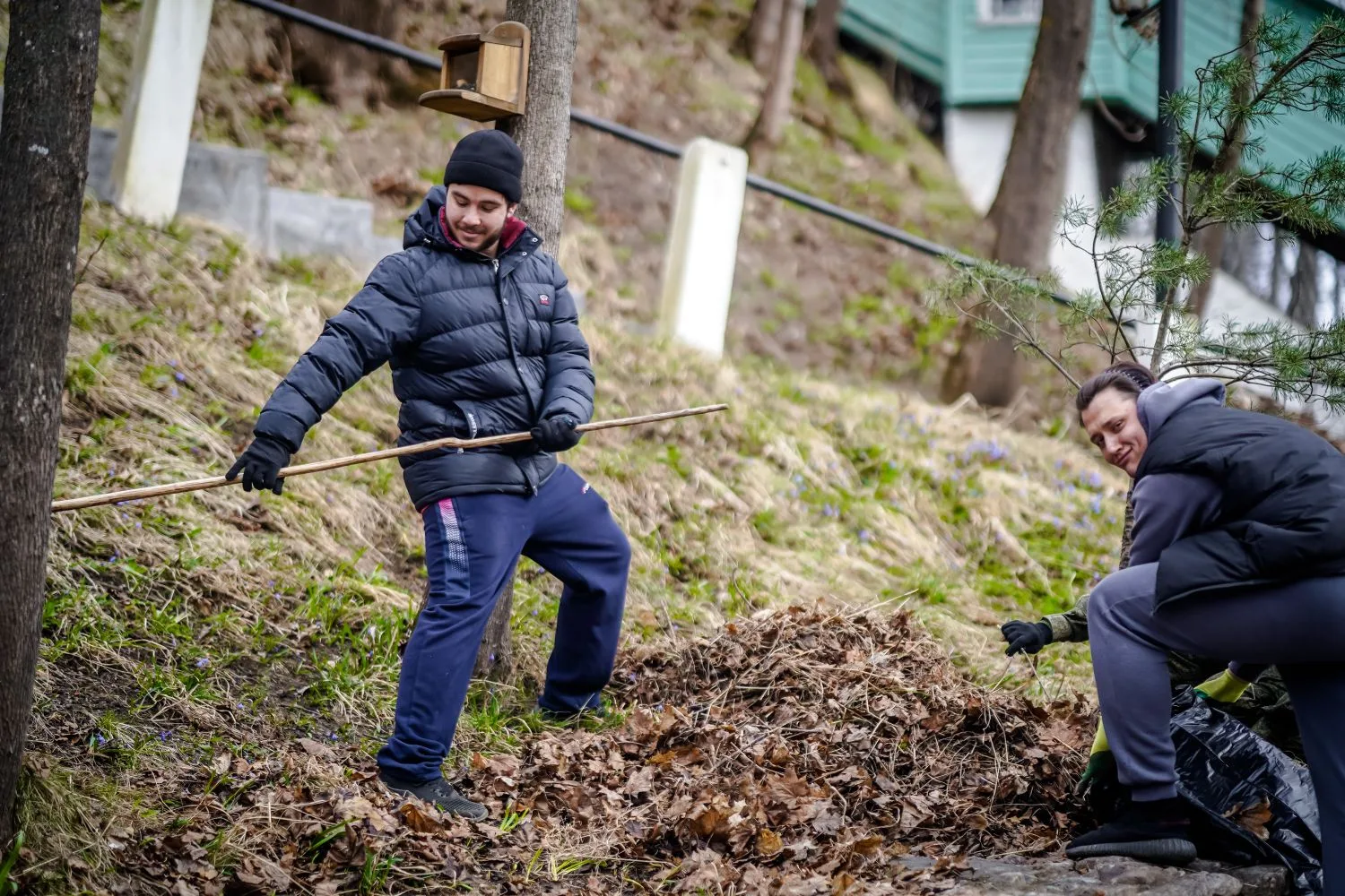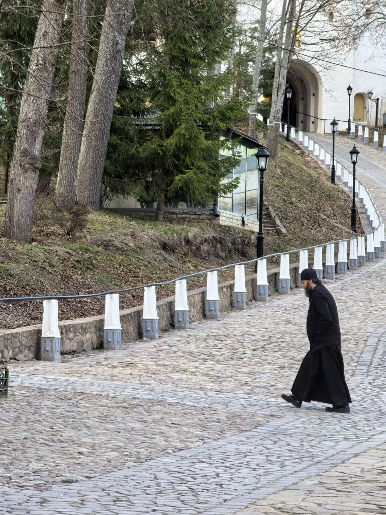 Начало подготовки территории Псково-Печерской обители к светлому празднику Пасхи кропотливыми трудами учащихся духовной семинарии