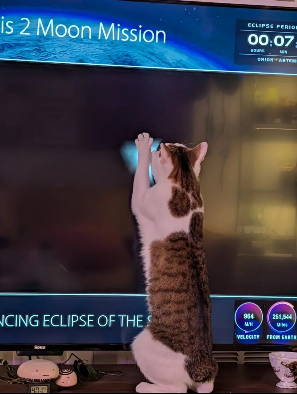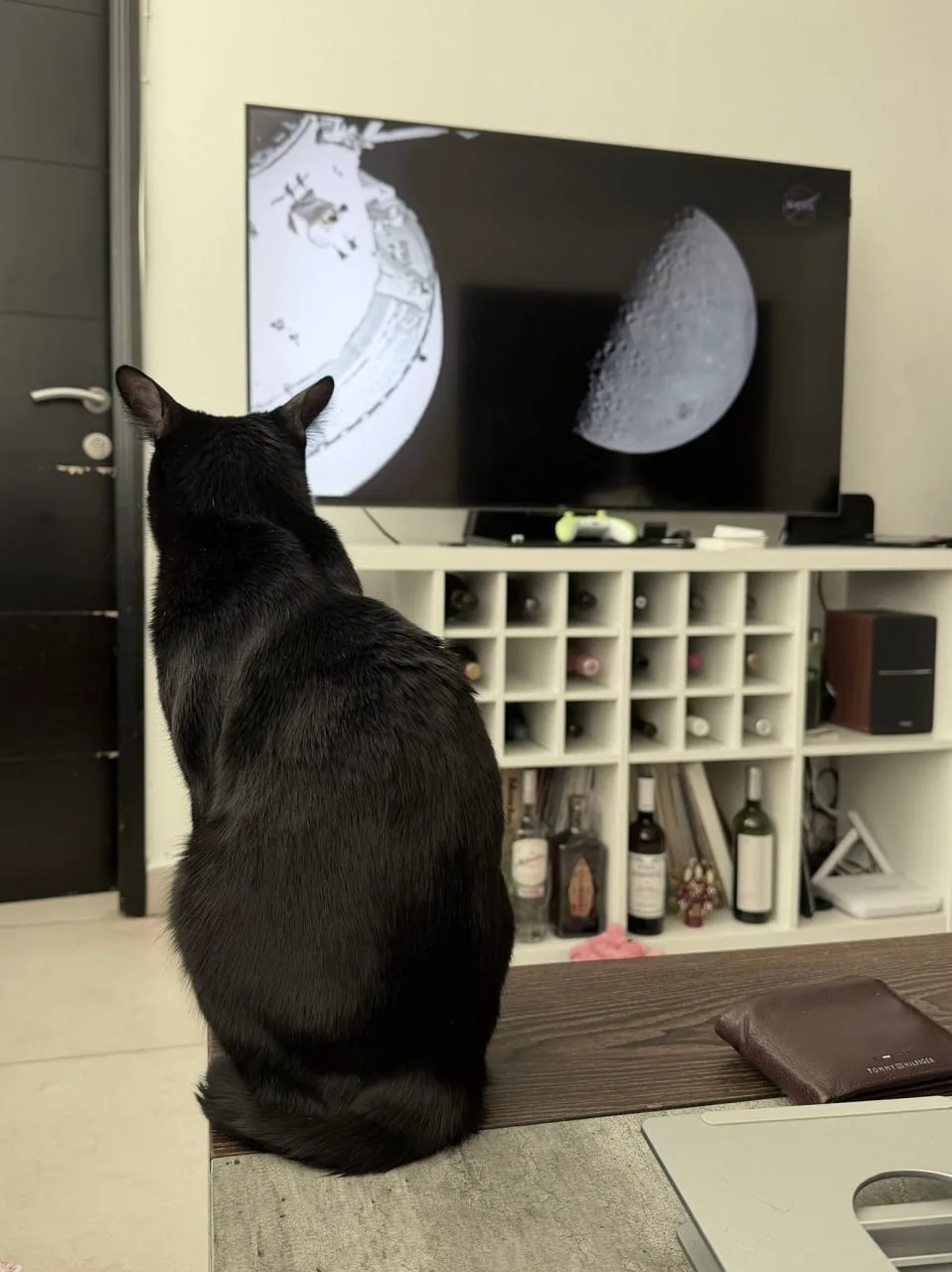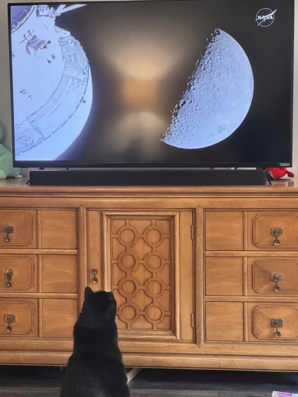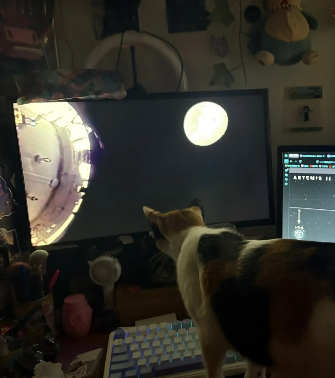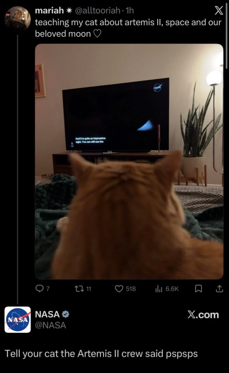 Девушка выложила твит с котом, который смотрит трансляцию миссии «Артемида-2». А NASA ей ответили: