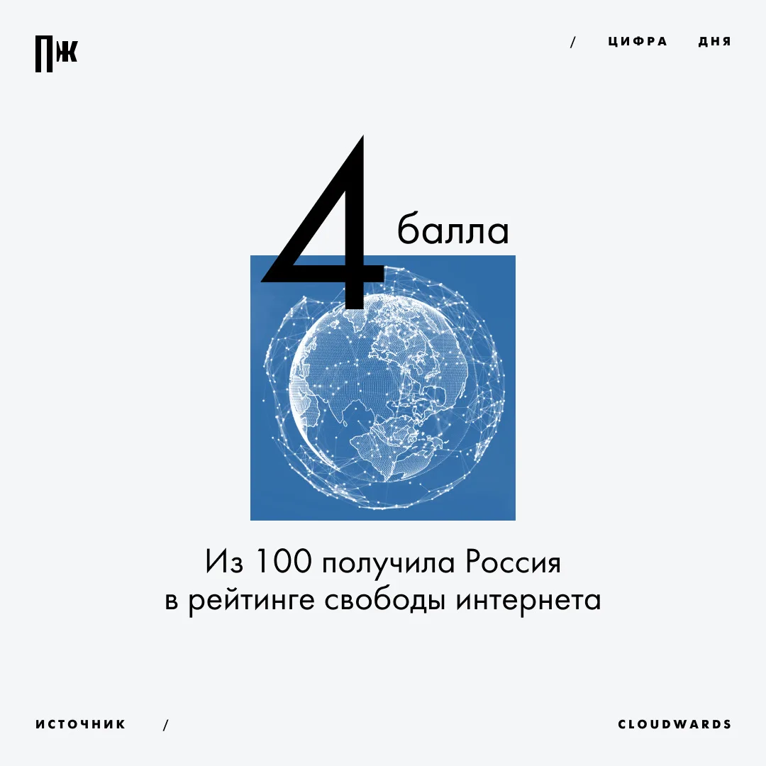 Столько же баллов у Ирана, в котором сейчас происходит самый длительный общенациональный блэкаут — более 37 дней подряд. Россия заняла в рейтинге предпоследнее место. Помимо Ирана эту строчку разделили так же Китай и Пакистан. Хуже результаты только у КНДР. Страна набрала 0 баллов в рейтинге свободы интернета и заняла последнее место.