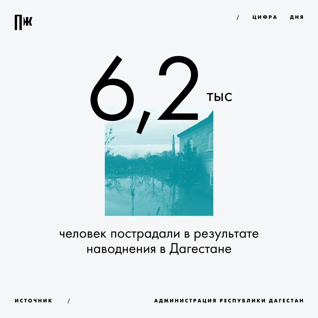 Грустная цифра дня: по последним данным более 6,2 тысяч человек пострадали от наводнения в Дагестане. Ранее сообщалось о гибели по крайней мере шести человек.