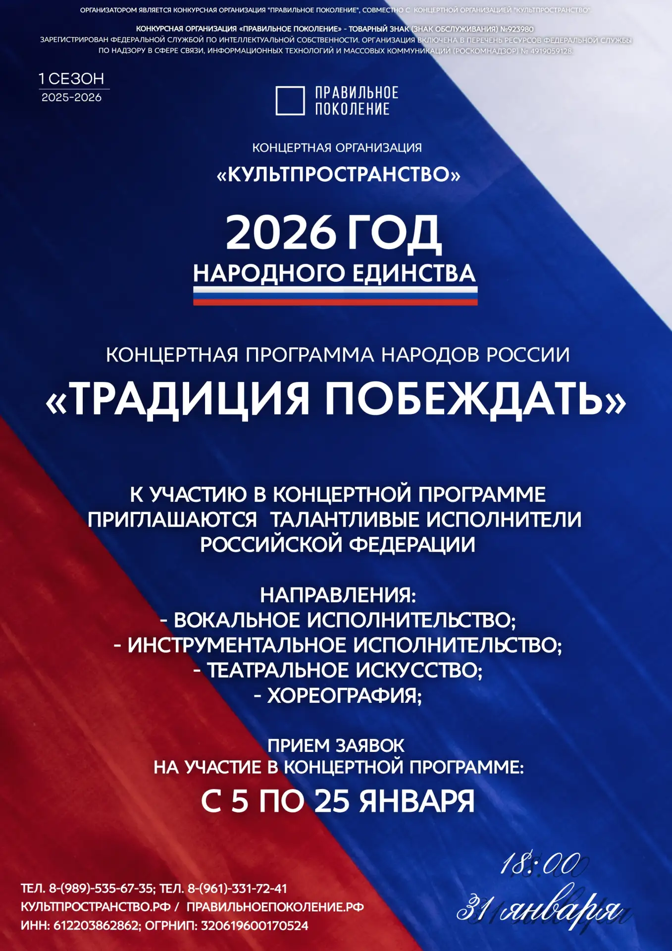 С 5 по 25 января 2026 года ведется прием заявок на участие в концертной программе народов России «Традиция побеждать», реализуемой в рамках года народного единства!