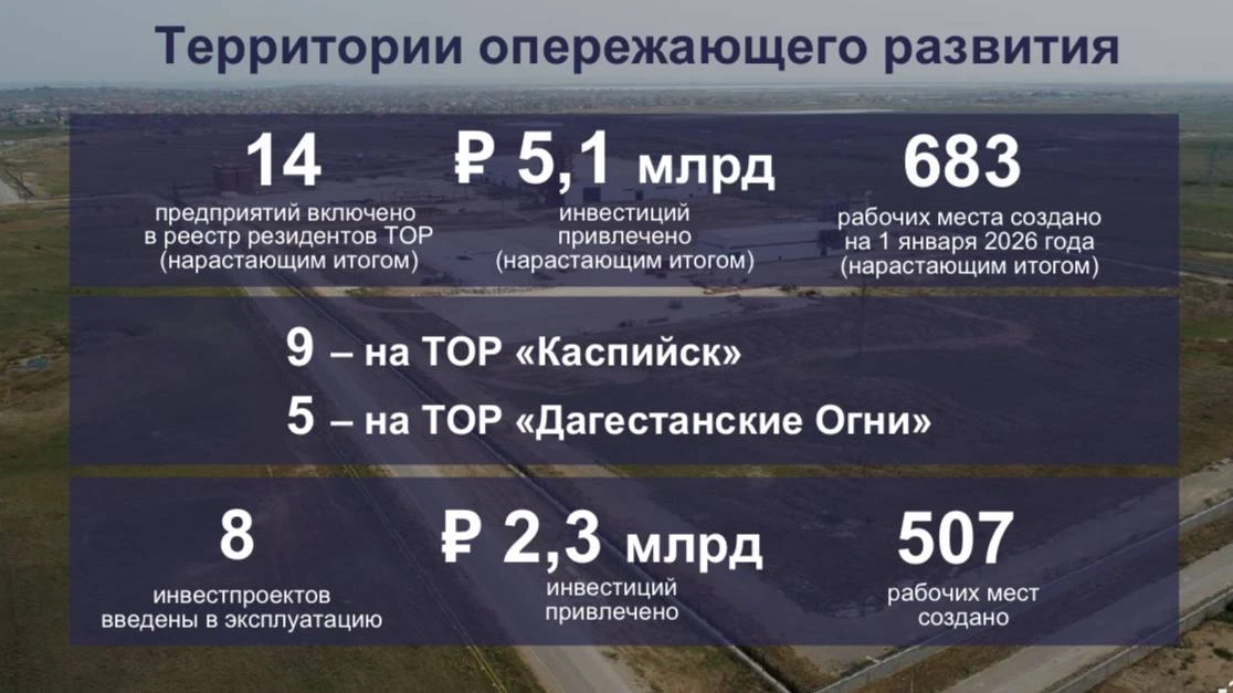 ❗️ В Дагестане функционируют две территории опережающего развития в городах Каспийск и Дагестанские Огни. На начало 2026 года в реестре резидентов территорий опережающего развития числится 14 предприятий (9 – на ТОР «Каспийск», 5 – на ТОР «Дагестанские Огни»), которыми реализованы и введены в эксплуатацию 8 инвестиционных проектов.