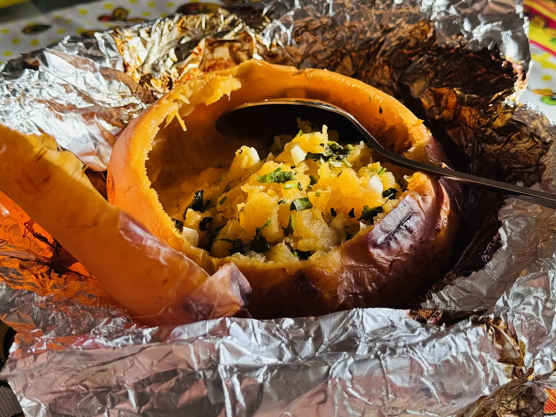 4. Ложкой отделите мякоть от кожицы. Посолите, добавьте измельчённую зелень и чеснок, лимонный сок и перемешайте