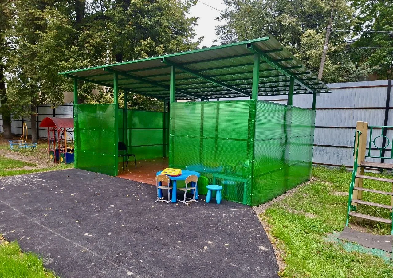 На улице установлены два современных теневых навеса, чтобы детям было комфортно играть на свежем воздухе даже в жаркие дни. Также отремонтировали дорожки.