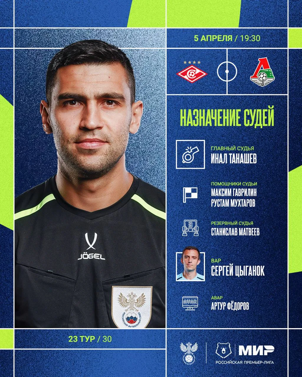 Инал Танашев рассудит «Спартак» и «Локомотив» в 23-м туре РПЛ, на VAR будет работать Сергей Цыганок.