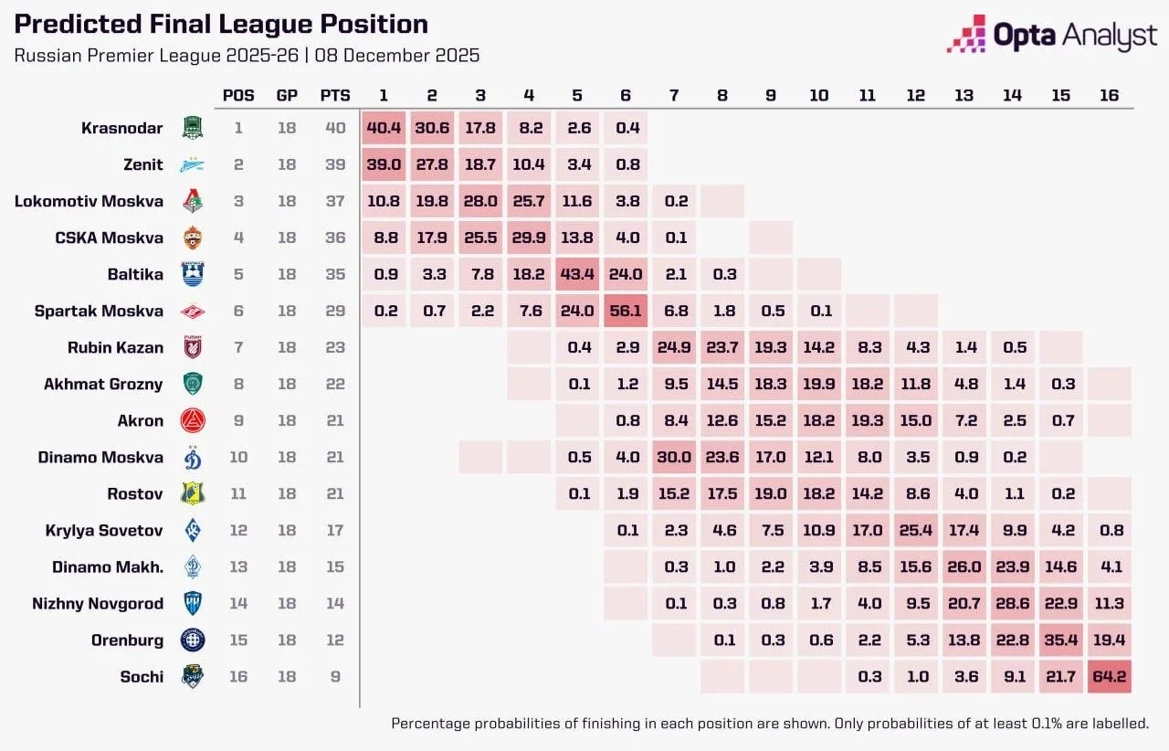 Суперкомпьютер оценил шансы команд РПЛ на чемпионство по итогам первой части сезона.