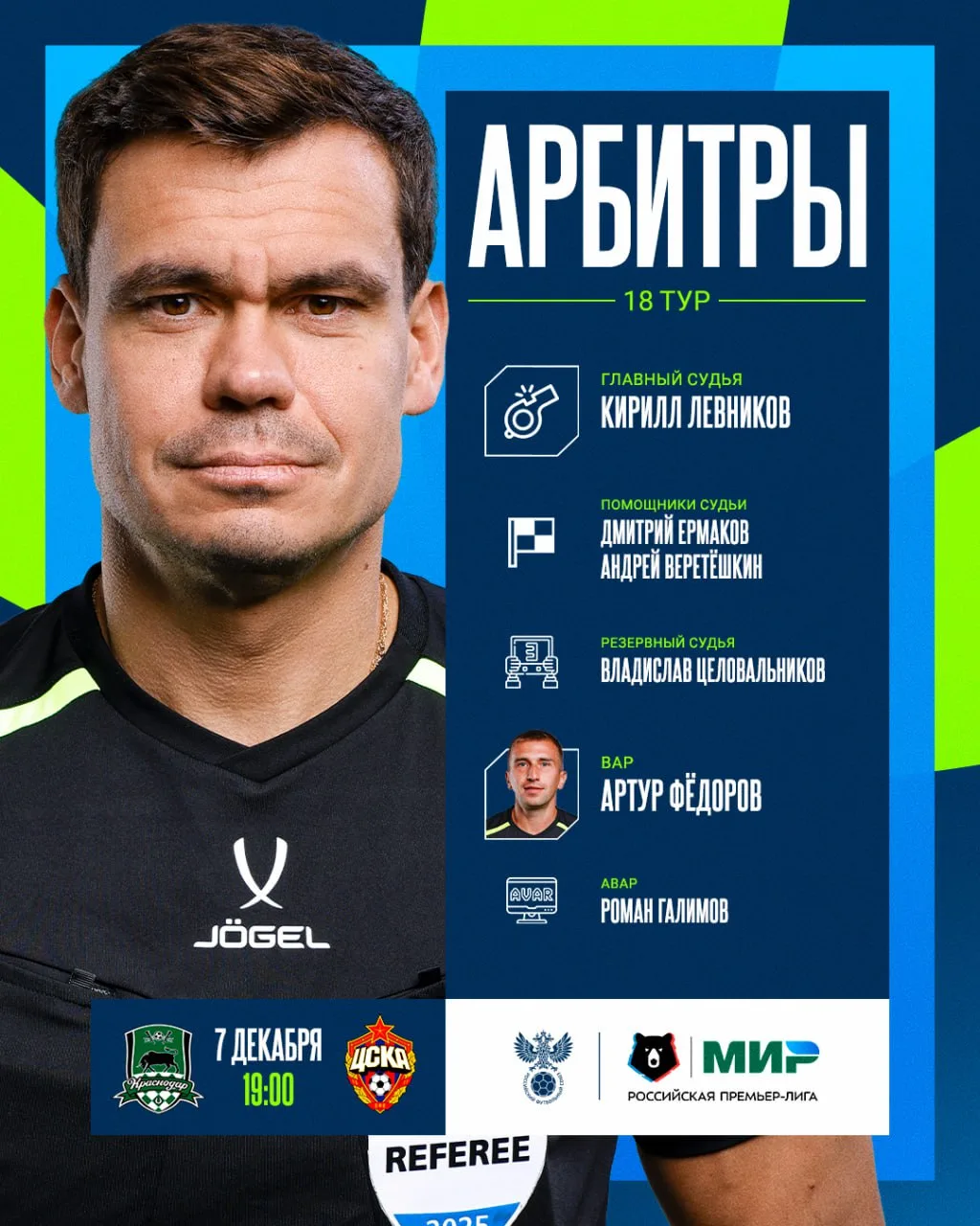 На матч «Краснодар» — ЦСКА назначен Кирилл Левников, за VAR отвечает Артур Федотов.