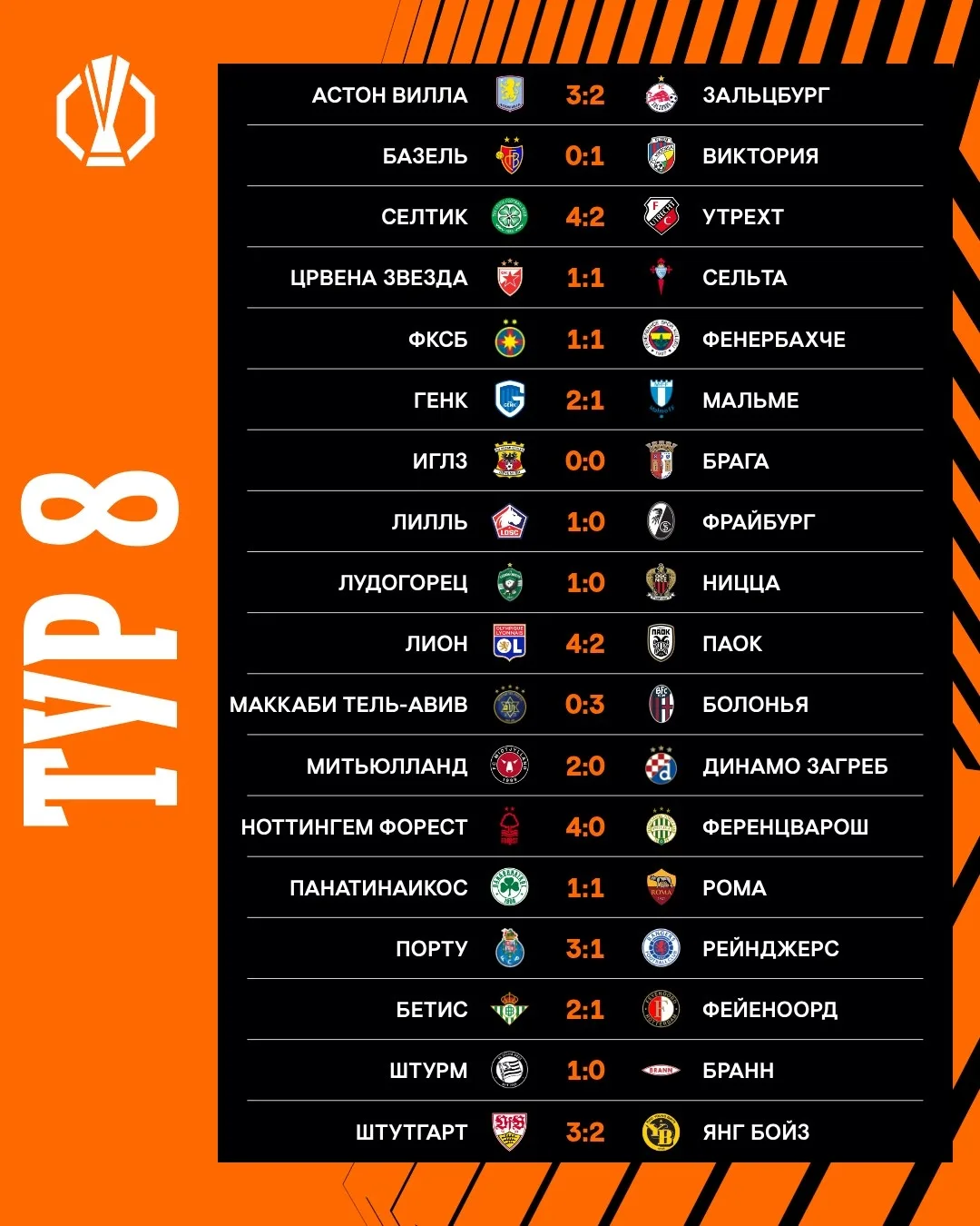 Лига Европы: «Лион» выиграл общий этап, «Рома» удержалась в топ-8, а «Селтик» заскочил в «стыки» благодаря яркой победе в восьмом туре.