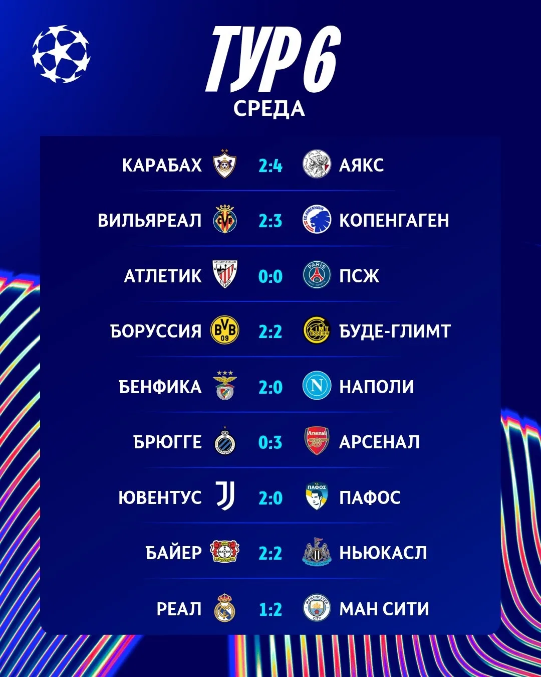 🏆 Цифры и факты первого игрового дня шестого тура общего этапа Лиги чемпионов: