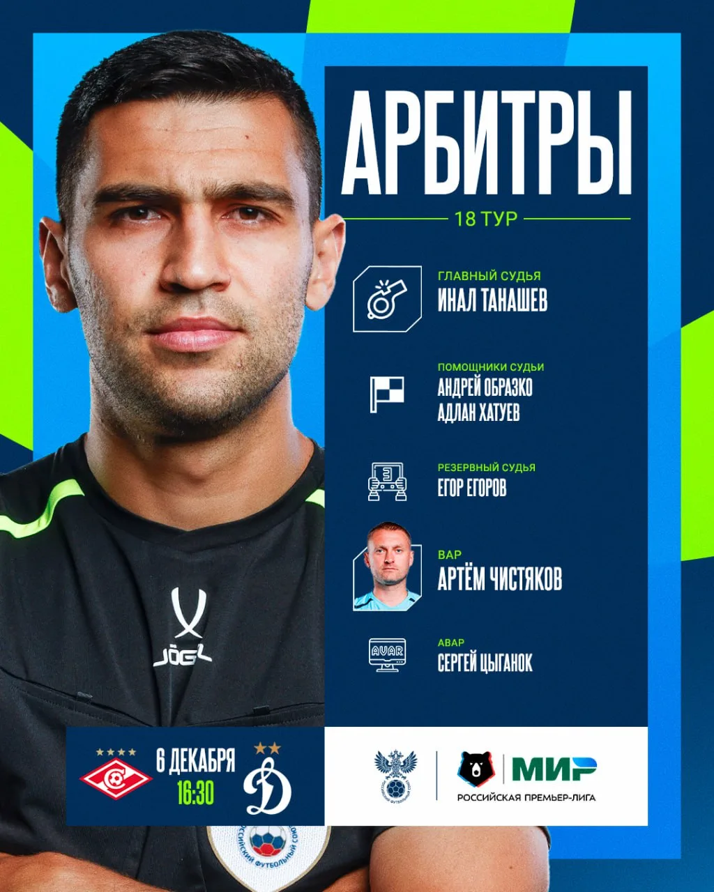 Инал Ташаев рассудит «Спартак» и «Динамо» в 18-м туре РПЛ, на VAR будет работать Артем Чистяков.