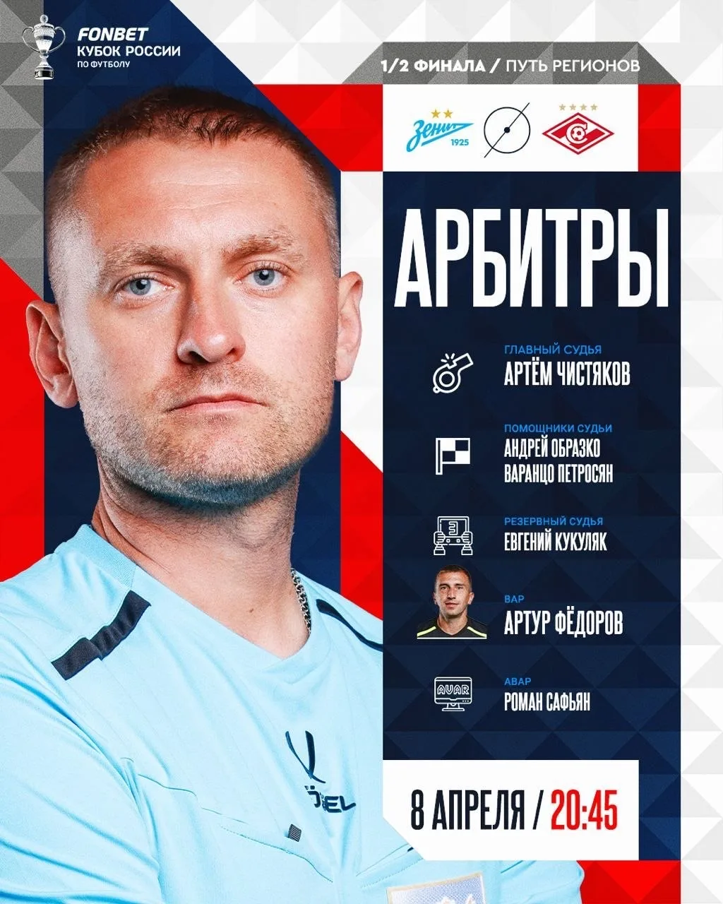 Артем Чистяков рассудит «Зенит» и «Спартак» в полуфинале «пути регионов» Кубка России, на VAR будет работать Артем Федоров.
