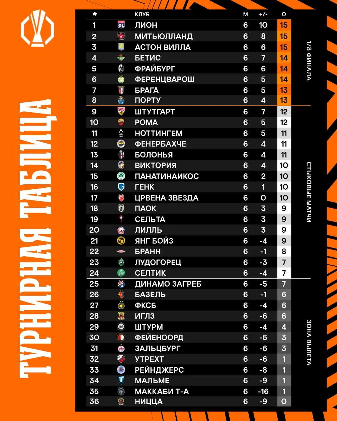 Турнирные расклады в Лиге Европы и Лиге конференций после шести туров общего этапа. Всего на этой стадии турнира команды проведут по восемь матчей.