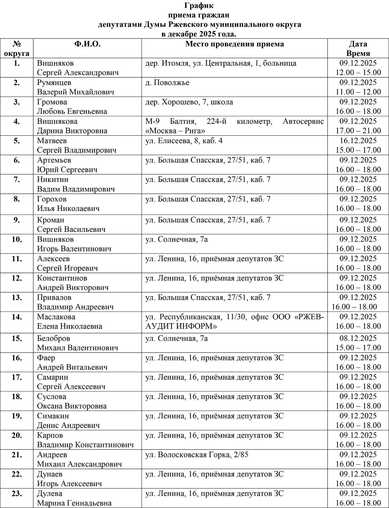 ГРАФИК ПРИЁМА ГРАЖДАН ДЕПУТАТАМИ ОКРУЖНОЙ ДУМЫ В ДЕКАБРЕ