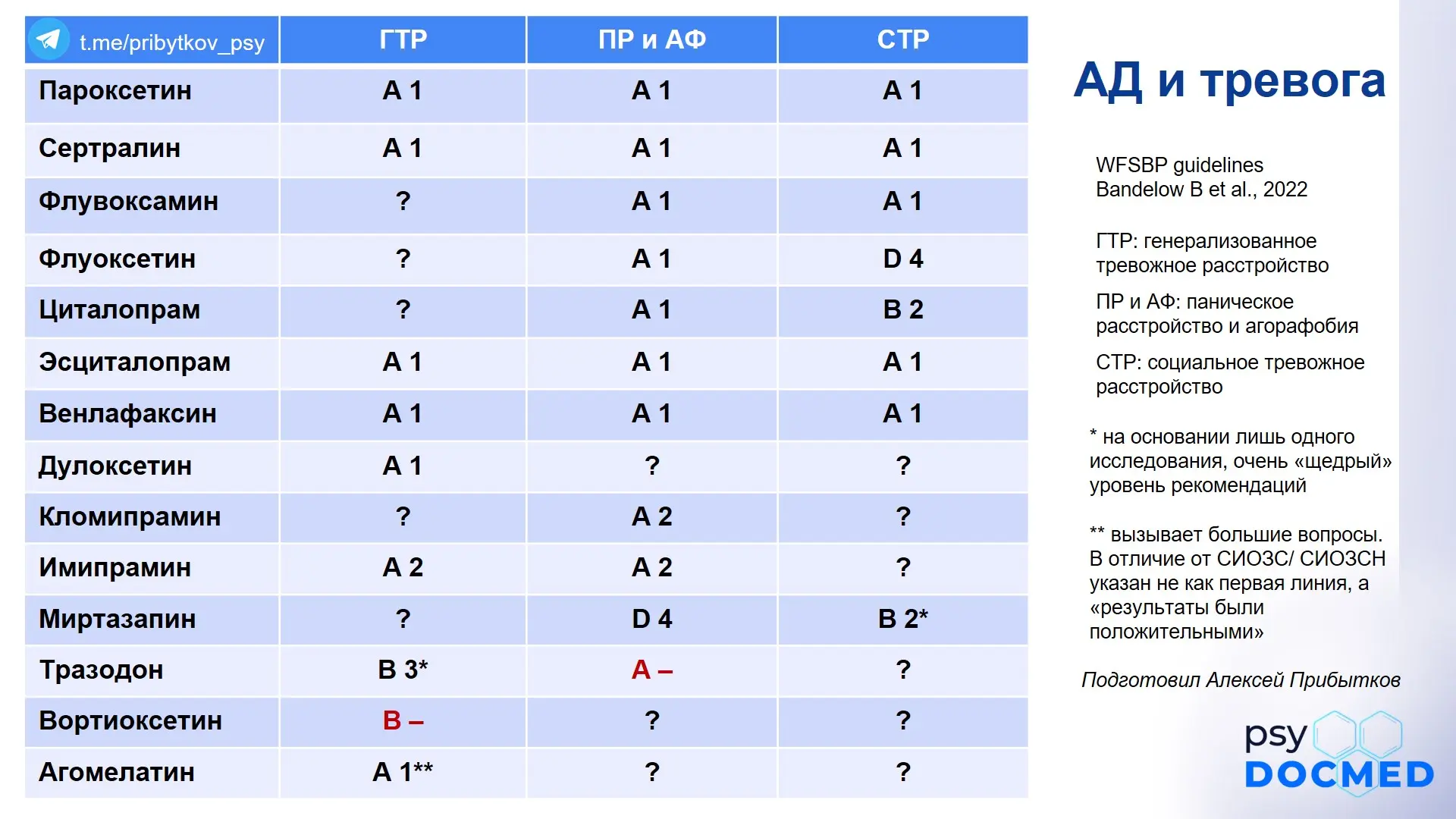 ✅ Мысль: не следует торопиться с назначением "запасных антидепрессантов". В большинстве случаев следует стартовать со "стандартного" препарата. Чаще всего, это будут СИОЗС (сертралин, эсциталопрам), а также (с оговорками) – венлафаксин. Другие тоже имеют "право на жизнь", но на старте терапии – как исключение, а не как правило.