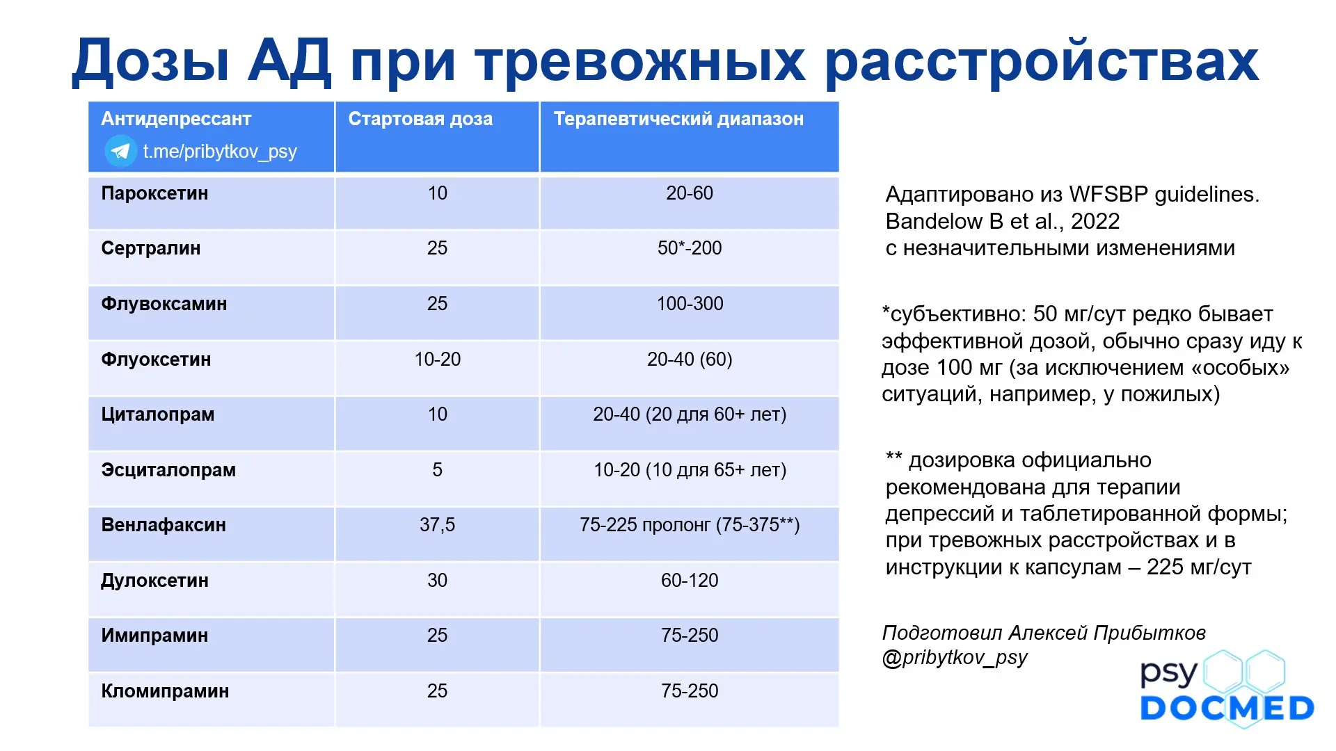 Абсолютного единообразия в рекомендациях нет, могут быть небольшие разночтения (поэтому у флуоксетина 20-40, а в скобках - 60), за основу взяты рекомендации WFSBP